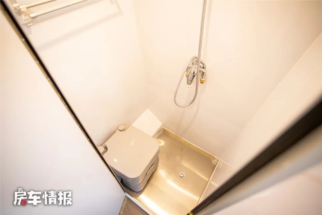 车内卫生间空间比较充裕,设备相对比较简单,提供了一个便携式马桶、淋浴花洒、洗手池等,当在内部洗漱时可以把便携式马桶拿出来,以此来增加内部空间,灵活性挺好。