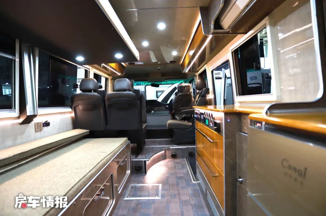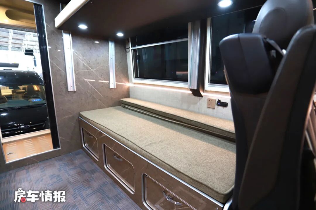 沙发后方是全车的休息区,上方的单人床为电动升降式的,平时可以按需调节所在位置,下方的单人床则可在有需要的时候拓展成一张双人床,上下铺总共可以容纳三名成年人使用。