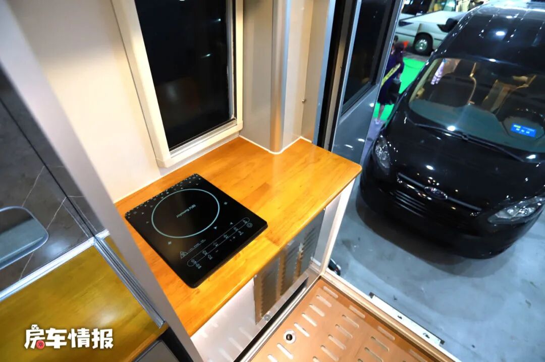 想要在这辆房车上做饭的话,可以选择车尾部的电磁炉,这样的设计可以减少炒菜时的油烟对生活区的影响,中间的推拉门很好的阻拦了油烟的走向。
