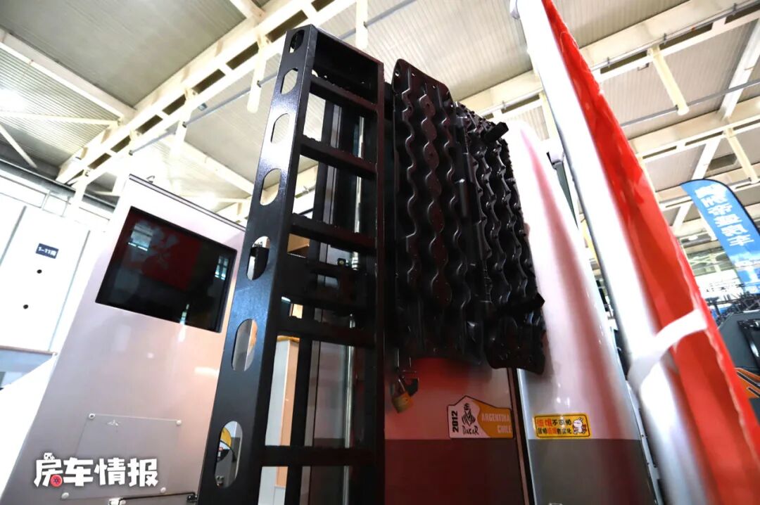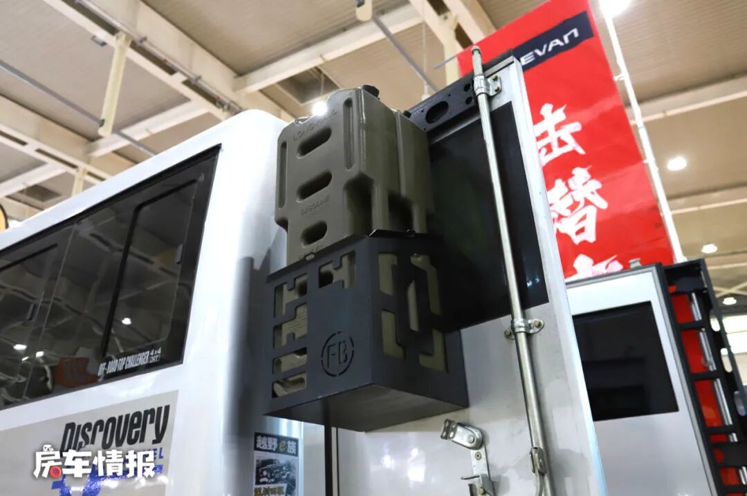 车厢外部配置了遮阳棚、储物舱以及水电接驳口等一些房车的标配,并且在车尾部还提供了脱困板爬梯以及一个外置的油箱。