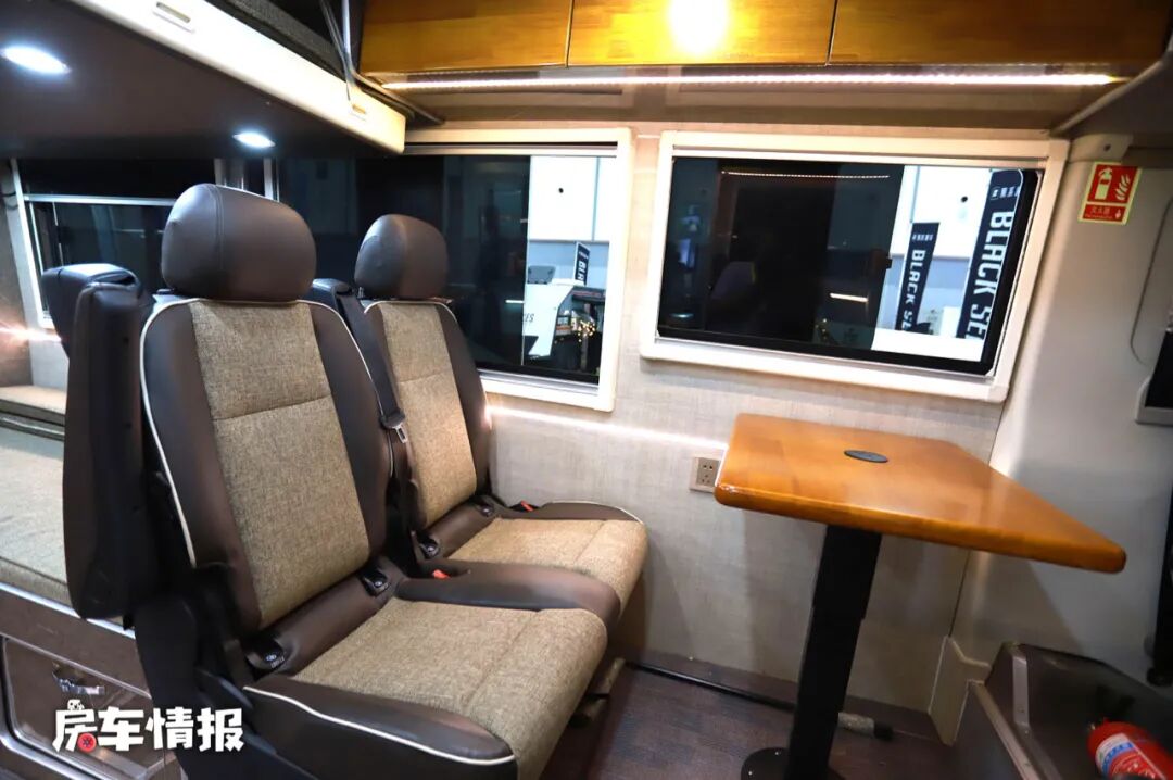 会客区内提供了一排双人沙发,采用的是汽车座椅,乘坐起来更加舒适,大尺寸的升降餐桌也足够满足平时在这里吃饭的需求,另外窗户也由常见的外推窗改为了推拉窗的设计,更加的人性化,即便在行车过程中也可以开窗欣赏风景,虽然是一辆中巴客运汽车改装的,但是整车在行驶过程中最多只能乘坐四个人。
