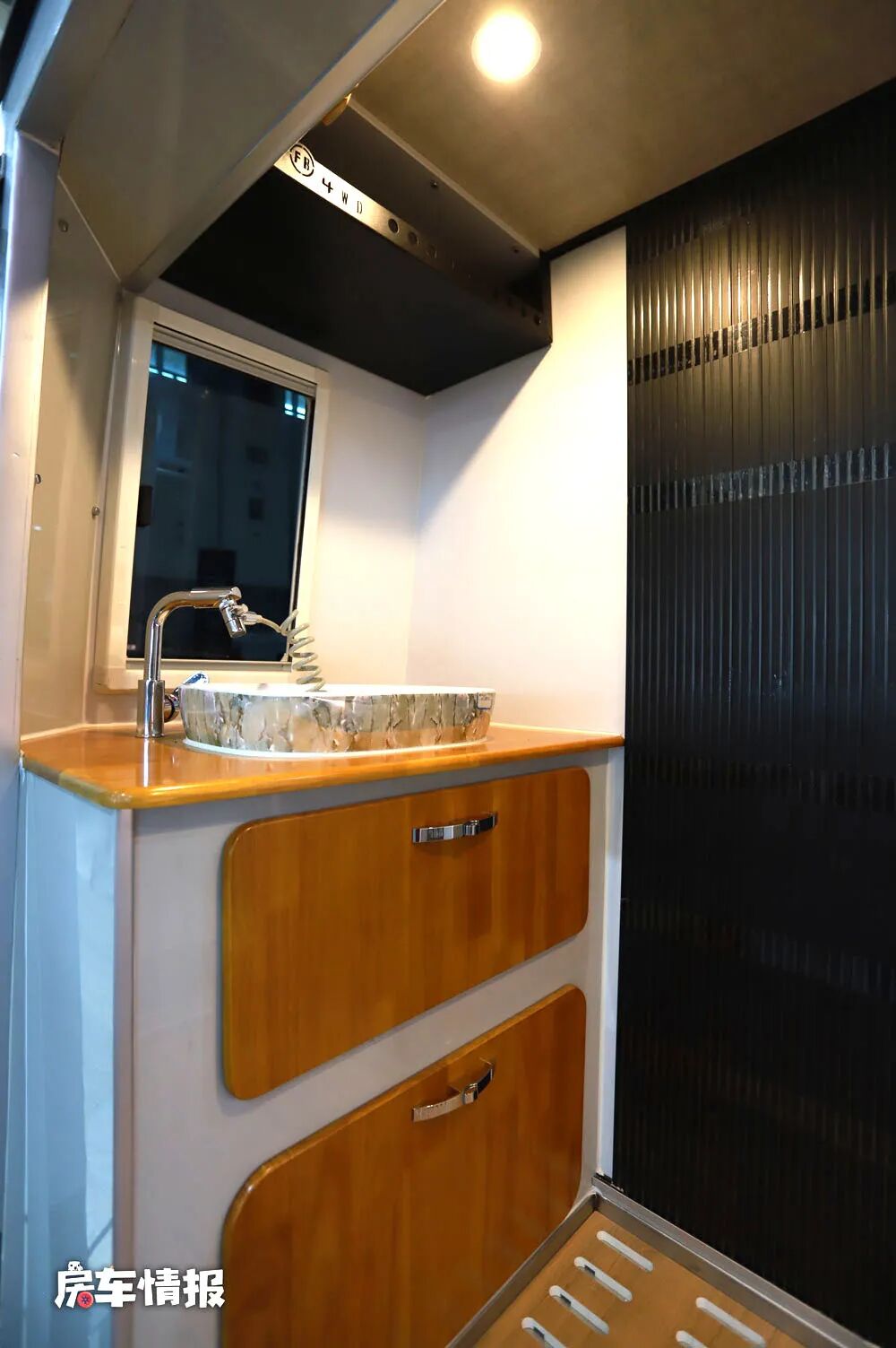 另外一侧则是带有抽拉式水龙头的水盆,因为下方铺设了防水地板,所以平时也可以在这里冲冲凉,另外全车还配备了一台便携式的马桶,所以基本的洗漱需求还是可以满足的。