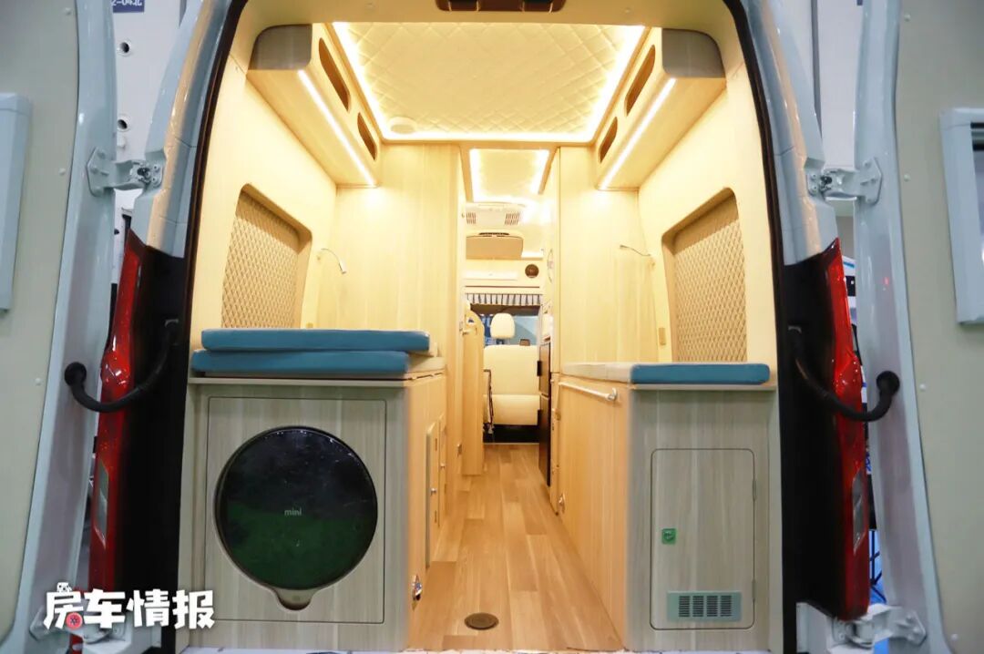 车厢尾部的休息区,平时可以将床板上翻过道用来存放行李,晚上睡觉的时候就可以组合成一张双人尾床,下面的空地也可以存放大件的行李,打开可180度平开的尾门还可以看到镶嵌在床板下方的一台进口大宇洗衣机,平时可以洗一些衣服,也比较的方便。同时顶部两侧都带有储物空间。