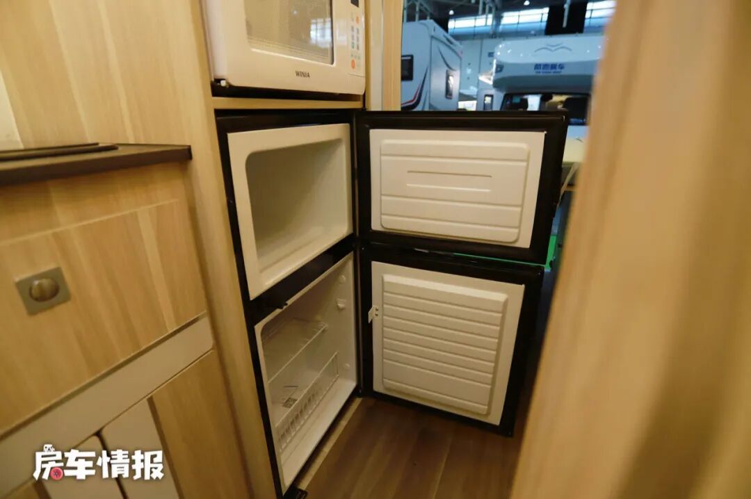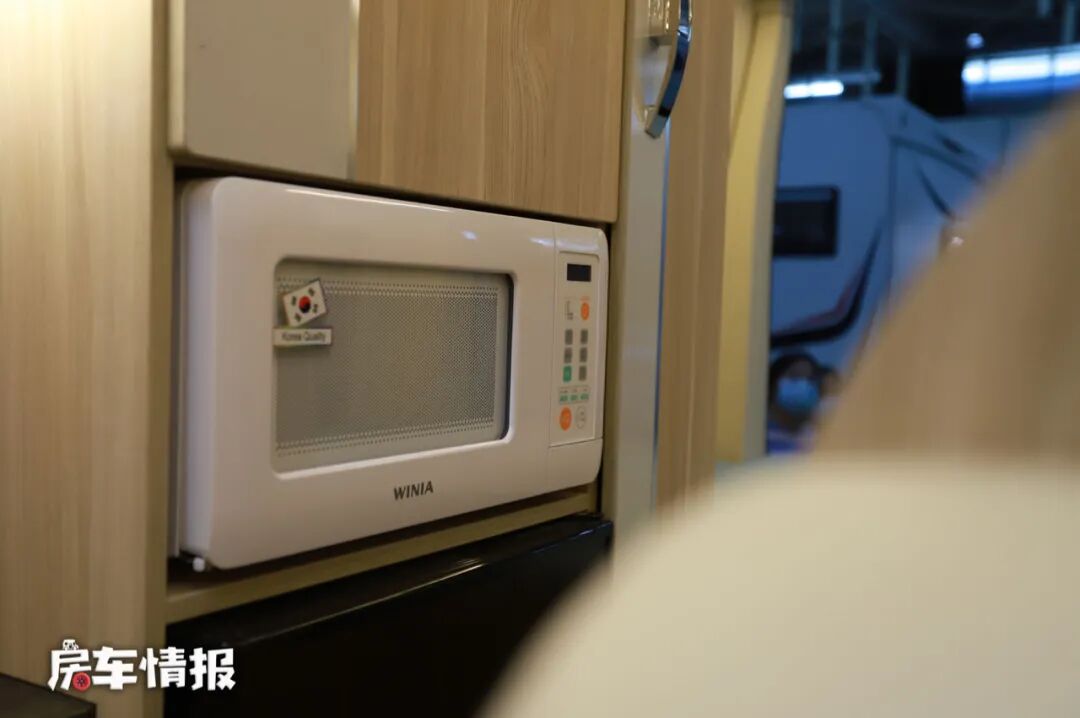 厨房区的配套设施也比较丰富,提供了电磁炉、带盖的不锈钢洗菜盆、储物空间、85L上下双开门冰箱、微波炉等,满足平时做饭做菜的需求,另外在橱柜的外侧还暗藏了一台抽拉式的燃气灶,如果怕大火猛炒给车厢内部带来污染,也可选择在车外进行烹饪。