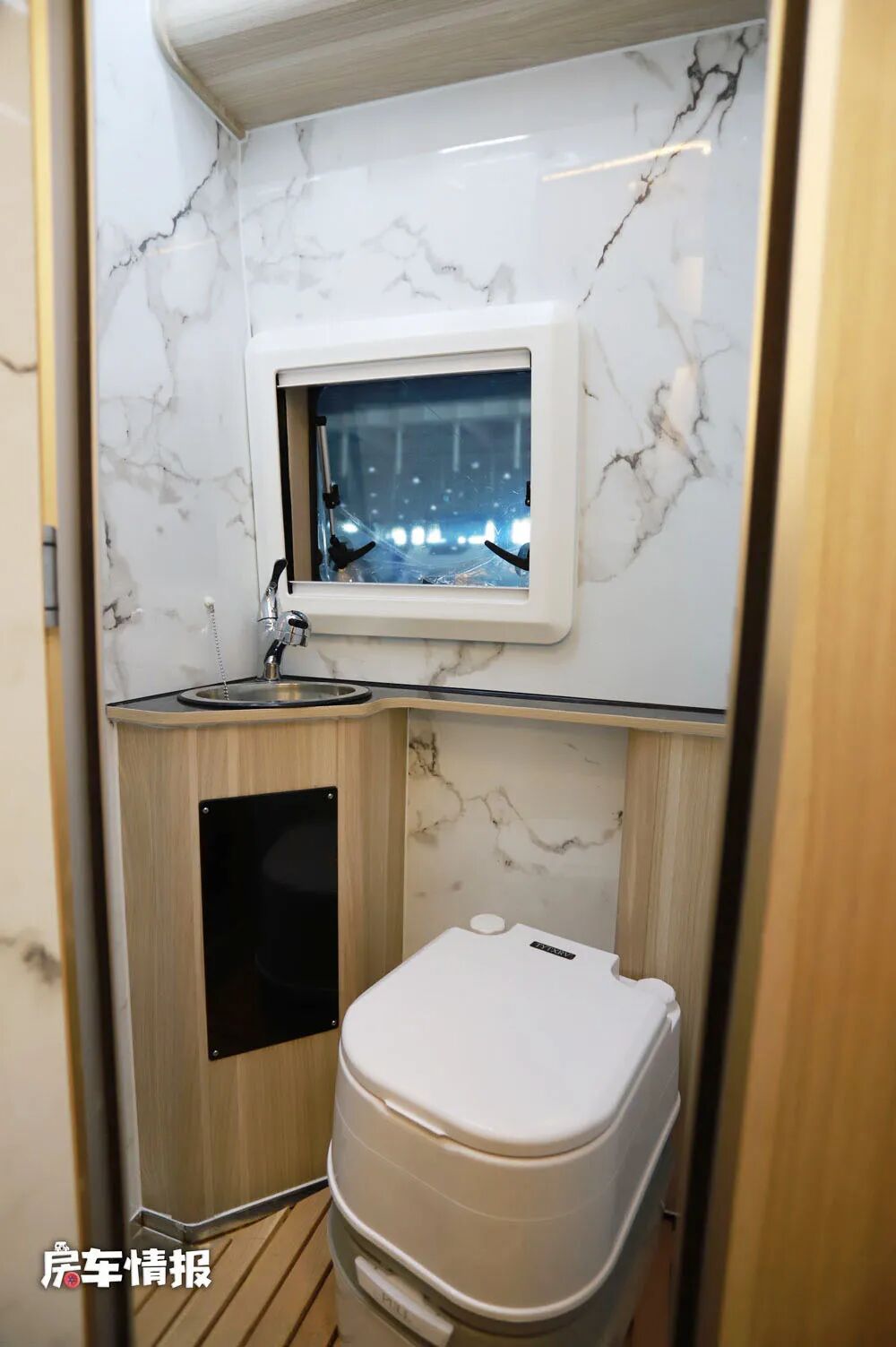卫浴室的整体面积不是很大,但是提供了一台便携式马桶,这个好处就在于当洗澡的时候,可以将马桶拿到外面,预留出更多的淋浴空间,使用起来也比较的灵活,另外还提供了洗手盆、双向换气扇、淋浴花洒、储物空间等,能够满足出行的洗漱需求。