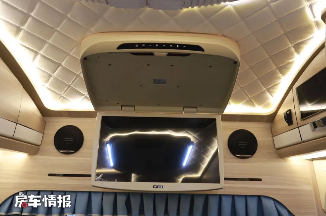 会客区的顶部采用了非常豪华的菱形软包设计,还匹配了一台22寸的翻转车载智能电视,平时坐在沙发上看看电视追追剧还是非常惬意的,配合全车提供的音响系统,可以带来更好的语音视听效果。