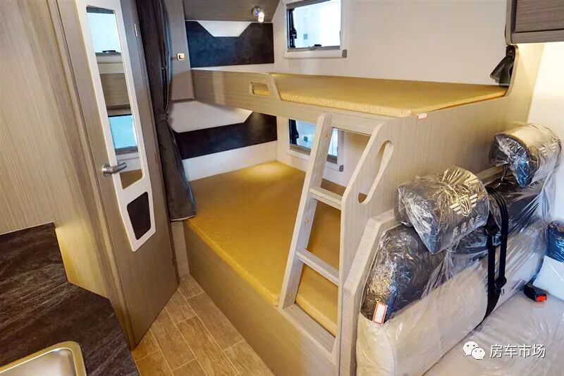 子母床结构的后置尾床,下床尺寸在2000*1200毫米,上床尺寸在2000*750毫米,内侧都安装有房车专用外推窗,子母床外侧配了布质隐私帘,可通过小爬梯到达上床。电路配置方面,该车有3000W工频充电逆变一体机、1000ah锂电池组(12度电)。同时该车还配有暖风系统系统,特莱尔定制冷暖两用空调,烟雾报警器及一氧化碳报警器等。
