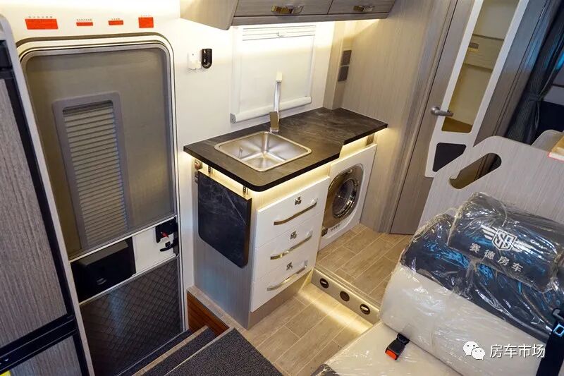 车内同样设计有多功能厨房料理台,台面可拓展配有不锈钢洗菜池、储物的大抽屉、2.5kg车载mini洗衣机。不同的是该车采用了美式车门的设计,配有一个可独立开关的金属网门,带宠物出行时可避免宠物跑到车外,还可避免抓咬时损坏车门。