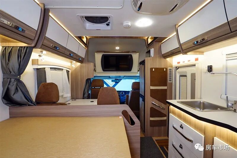 该车底盘标配150A+150A双发电机、6轮胎压监测、ESP车身稳定系统、倒车影像以及倒车雷达等。驾驶舱上部配有一张2米额头大床,床板掀起安装有一台32寸液晶网络吸顶电视。会客采用L型沙发布局,中间是一张手动升降餐桌,降下餐桌能拼床。整车荷载4人,车内上部都安装有储物吊柜,会客区对面有一台可温度调节的140L车载冰箱。