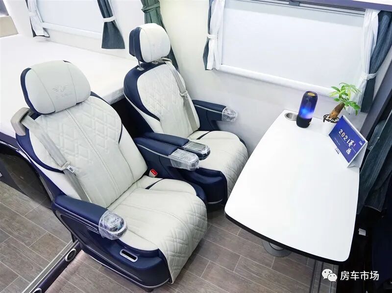 小额头房车在驾驶舱的上部空间因没有过多的设计所以空间宽敞,能站直身体,驾驶舱与生活区采用贯通式的设计,顶部配有全景曲面天窗。会客区配有航空座椅带电动加热按摩等功能,前部配有气动升降餐桌可多方位移动。内侧配有外推窗,顶部配有多美达双转子冷暖空调以及12v双向换气扇。