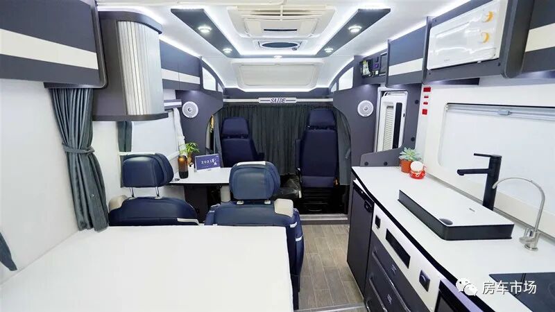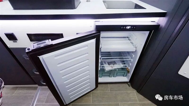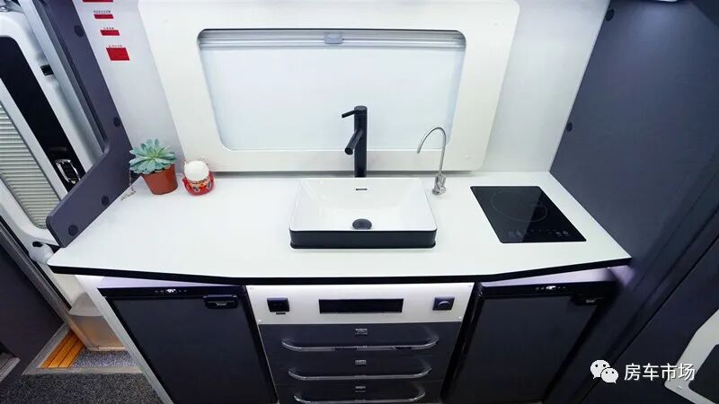 车内打造了厨房操作台,配有陶瓷洗菜池、水龙头、直饮水龙头(该车配有3M净水过滤系统),152L开门车载冰箱(可温控),中部设计有三个置物大抽屉。