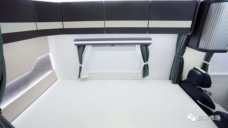 车尾配有纵置大床尺寸是1.9*1.3米,床头有灯带内侧有外推窗,外围安装有布帘既隔光还保护隐私,上部都安装了储物吊柜。电路配置包括3000W逆变器、1000ah锂电池组、560W太阳能板。