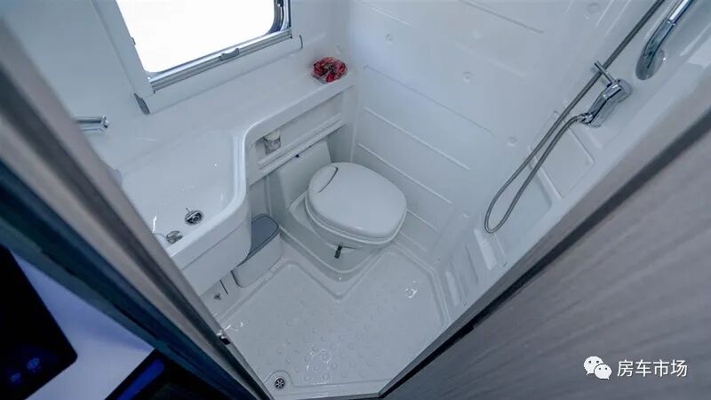车内有一体式吸塑卫浴间,防霉防潮好清洁,门外配有梳妆镜,内部配有独立淋浴花洒、进口电动马桶、面盆、外推窗顶部配有12V换气扇。水路系统该车配有200L净水箱以及40L灰水箱。