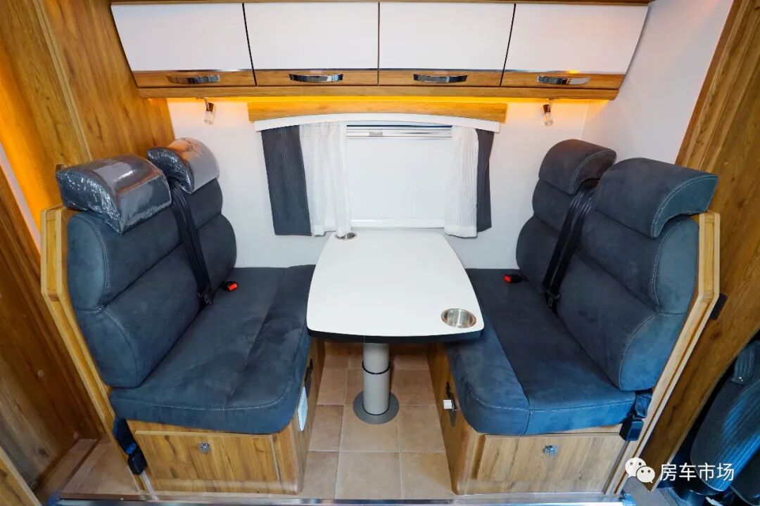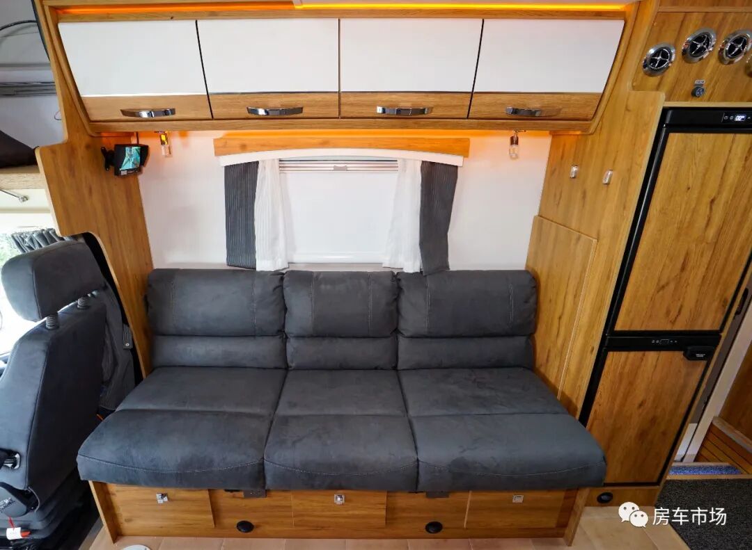 人员活动的大客厅就占了生活区面积的三分之二,配有能坐下4人的卡座沙发,对面还有3人座的大沙发,并且客厅位置带拓展机构,拓展打开之后中部的过道面积也较宽敞,两个成人能并肩行走。配上深色稳重的内饰装修风格,满足车友的商旅需要。