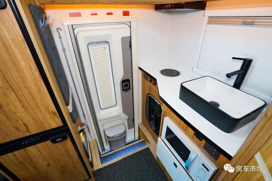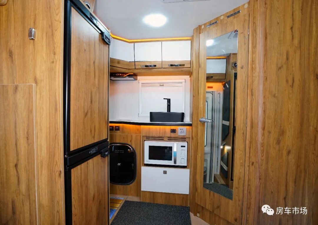 后部是厨卫区,配有152L双开门大冰箱,陶瓷池子、电磁炉、车载洗衣机、微波炉,车载吸油烟机等设施。料理台内侧配有外推窗,上部是储物吊柜。