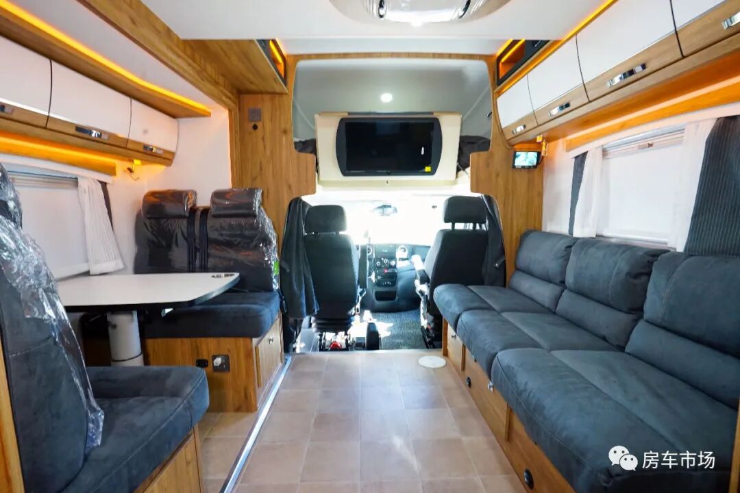 房车有着出色的功能性,不仅能满足旅居需要,还贴合精神世界。白鲸系列房车就有着丰富且多样的内饰布局,下面这款是来自车友定制的后进门单拓展车型(在符合公告的要求下简单定制),后置厨卫前部大客厅,原木色家具搭配深色系内饰,打造出集商务办公与休闲旅行于一体的风格。