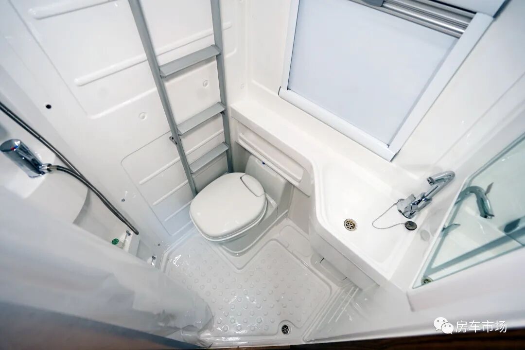 车内配有独立式吸塑卫浴间,卫生间门的外部设计有穿衣镜,内部设施包括盒式马桶、面盆、除雾镜、可调节高度的淋浴花洒,内侧有外推窗顶部有换气扇。整车的水电配置也非常丰富,有280L净水箱、60L灰水箱,3000W逆变器以及1000ah锂电池组(12度电)。