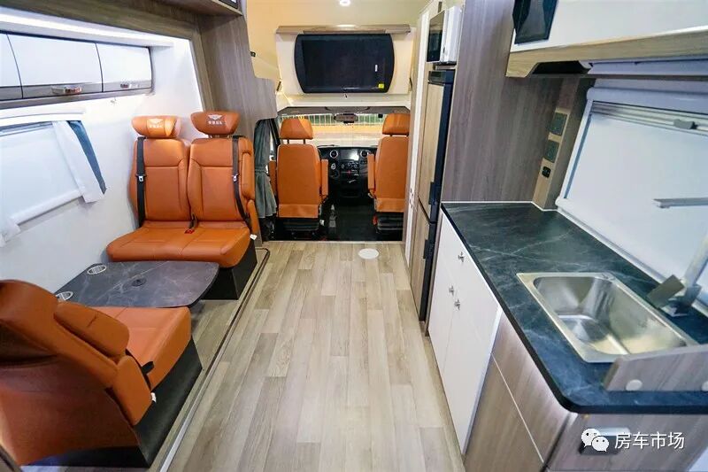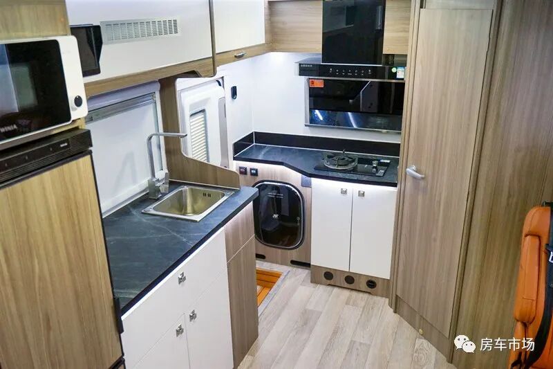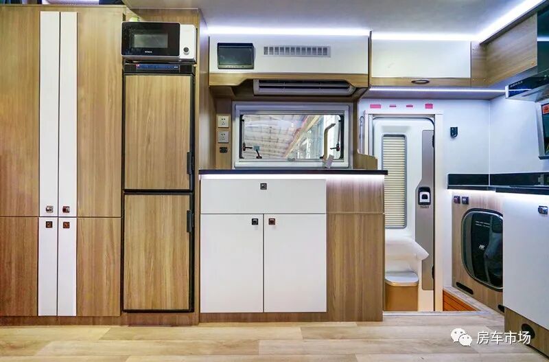 会客区配有升降餐桌,驻车时能拼成一张单人床。对面打造有多组功能柜,并设计了家用尺寸的大衣柜,能收纳被褥放衣物。配有微波炉、12V-152L双开门车载冰箱,高弯水龙头+不锈钢洗菜池,可选装车内燃气灶+大功率吸油烟机,配有车载洗衣机。该车还配有9000W暖风系统以及9000W热水系统
