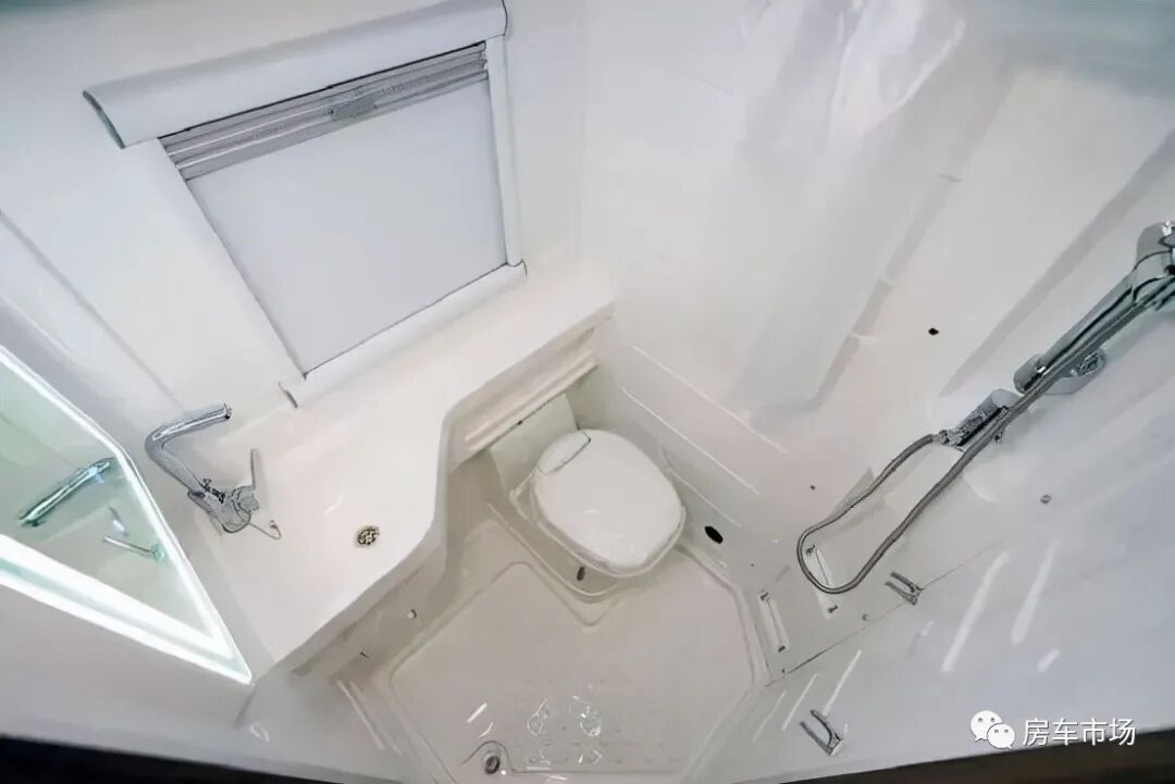 车内设计有吸塑式卫浴间,干净好清洁还防霉防潮。配有进口盒式马桶、独立淋浴花洒(可调节高度)、面盆+高弯水龙头,除雾化妆镜,并安装有外推窗顶部配有12V换气扇。