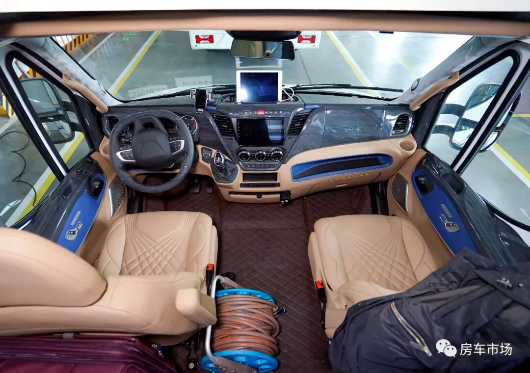 驾驶舱操控台做了软包处理,座椅也做了真皮包覆舒适美观。正副驾驶都配置了安全气囊,副驾驶可以180度旋转,驾驶座椅采用悬浮式,长途旅行舒适度高。
