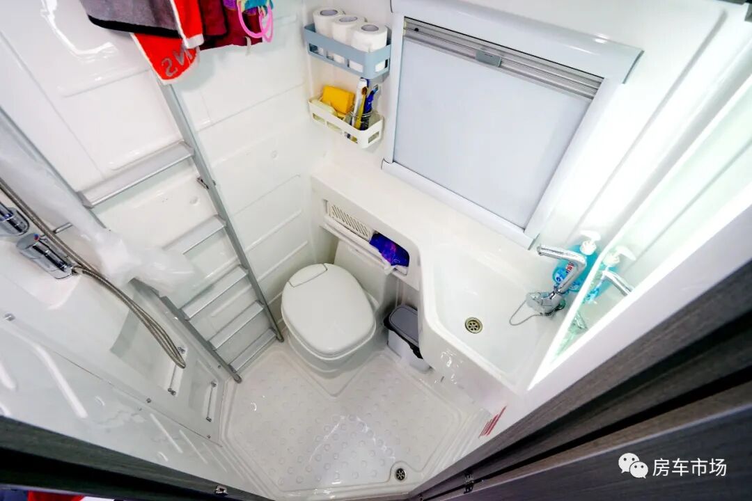 尾部设有独立卫浴间,一体成型设计配置也是齐全,盒式坐便器,9000瓦热水系统,淋浴花洒,户外也配备了一套。