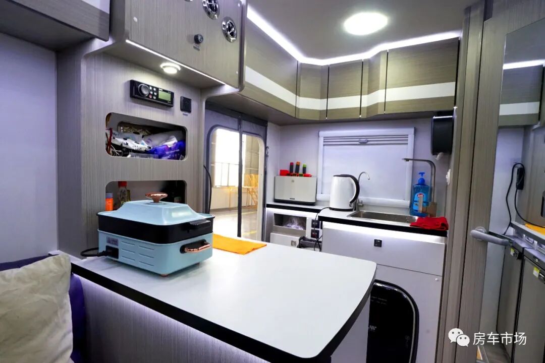 厨房配置比较齐全,152升车载冰箱,洗衣机、微波炉、洗菜盆,做饭很方便,车外还配有多功能抽拉厨房,全车配置了280升清水,30升的灰水箱,用水无忧。