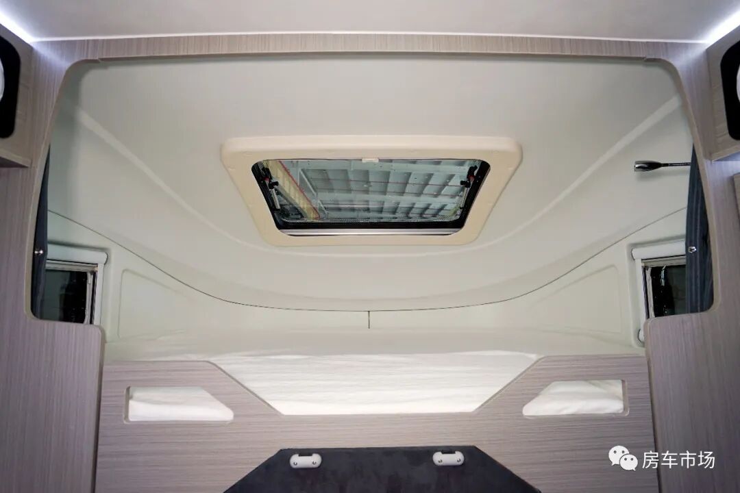 进口依维柯底盘前脸中网成点式分散蜂窝状科技感强,全车三明治玻璃钢厢体,前部大额头尺寸更大也显得圆润,如鲸出大海气势磅礴,额头上部有大尺寸天窗,打开通风采光透气效果俱佳,晚上可以考虑多看会星星了,侧面也有外推窗可以随时观察车外情况。