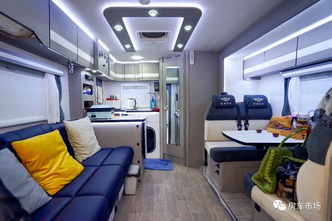 为什么选择后门设计,很大原因是这种内部设计空间感极好,再加上侧拓展又增加了整体面积。进门是厨房和卫生间,车内视线开阔无家具遮挡,左侧为对坐卡座设计,右侧为条形大沙发,前部为驾驶舱和额头床。全车E0级别环保板材,环保PVC地板革。