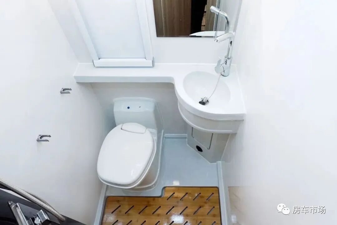 车尾拓展打开之后可形成一张双人大床,尾部的内侧安装有房车专用外推窗,保障日常的采光和换气,上部还设计有一组储物吊柜,外围还安装有隐私布帘。车内设计有独立的卫浴间,设施包括房车专用马桶、面盆+水龙头、淋浴花洒、化妆镜、防水浴帘、换气扇等。水电路方面,该车标配3000W逆变器、800ah锂电池、280L净水箱以及60L灰水箱。