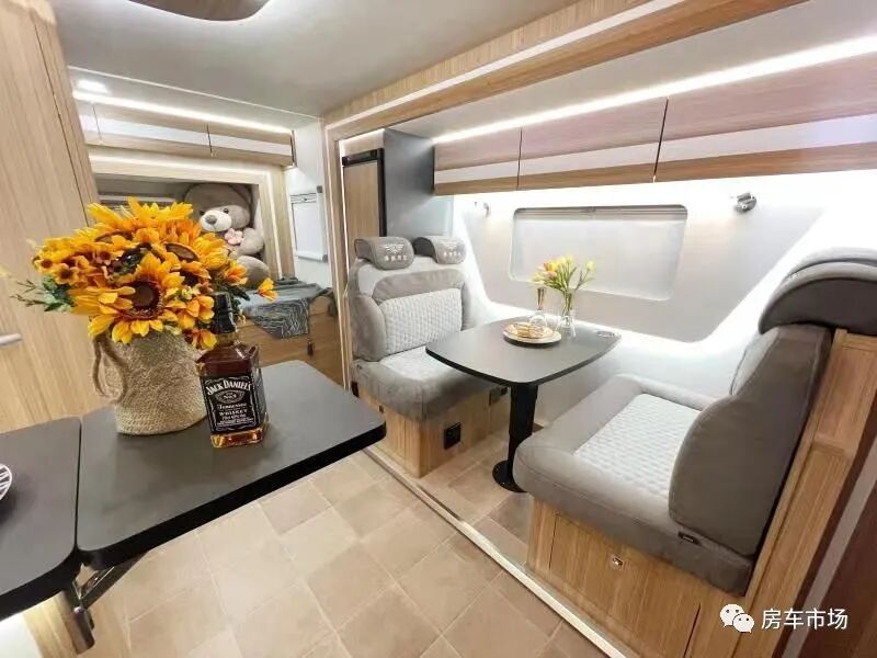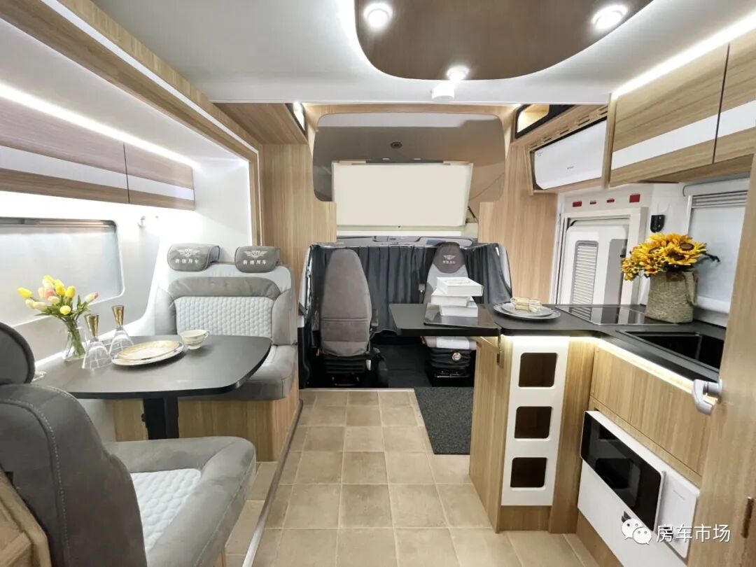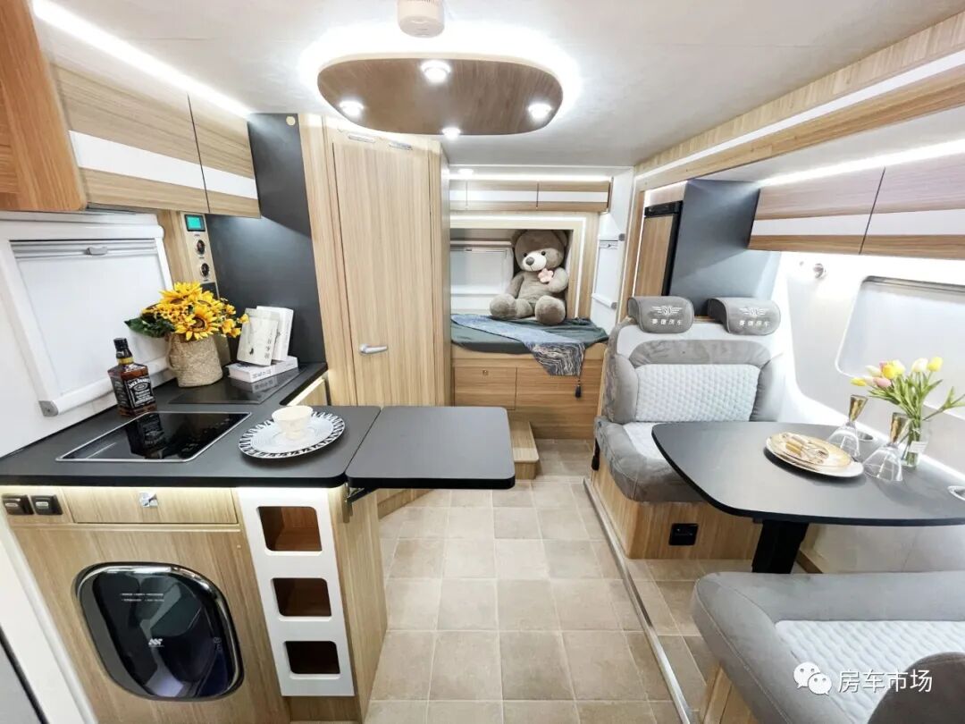 驾驶舱配有多功能方向盘、正副驾驶安全气囊、ESP9.3、定速巡航、倒车雷达,底盘带有150a+150a的双发电机。驾驶仓顶部是一张2米的额头大床,同时副驾驶可向后部旋转。整车核载6人。车身配有侧拓展以及后拓展,内部空间非常宽敞,打造有卡座沙发组成的会客区中部设计有可升降式餐桌,可组合拼床一张单人床,内侧是房车专用外推窗,上部还有一组储物吊柜。
