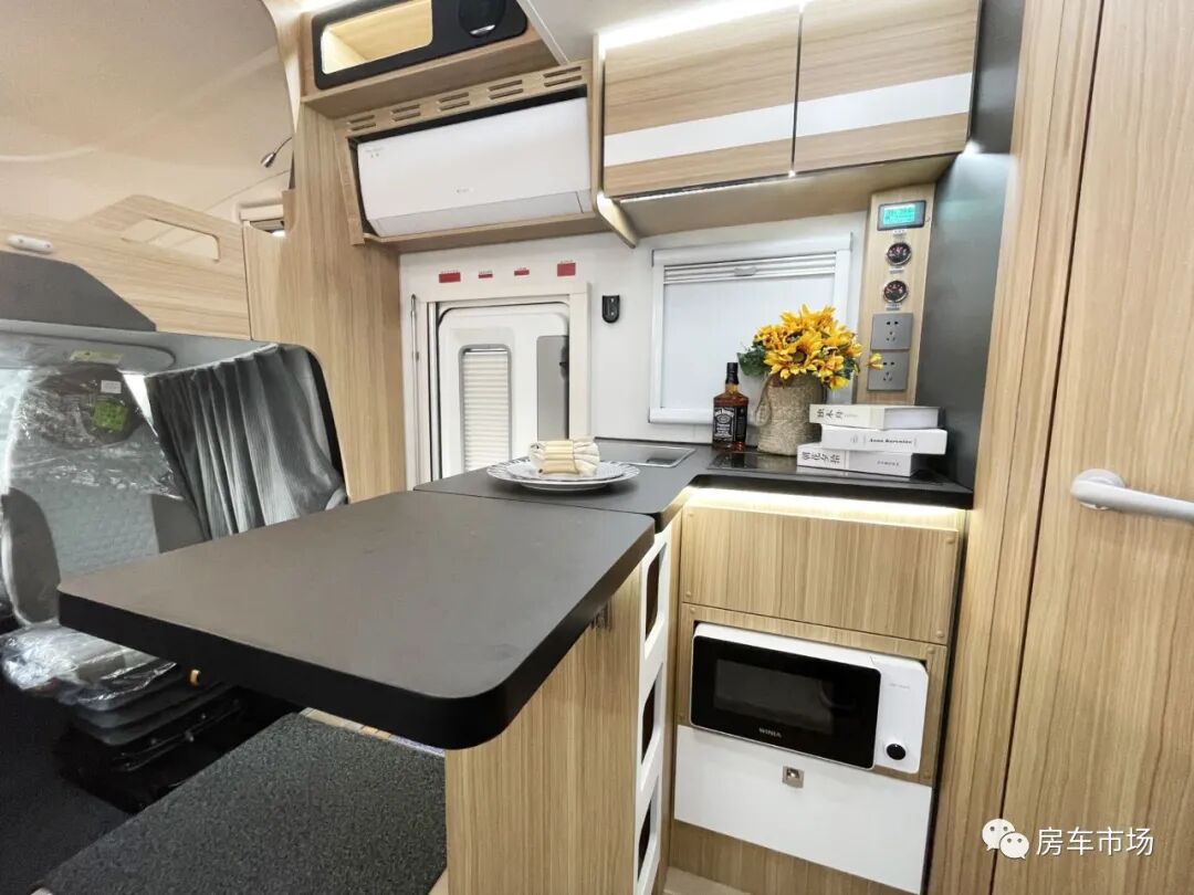 会客区对面是多功能橱柜,台面可拓展,配有洗菜池、微波炉,12V-152L车载冰箱下部还配有内嵌式车载洗衣机。冷暖系统配置方面,该车标配5000W暖风系统以及一台家用空调,同时该车还配有9000W热水系统。