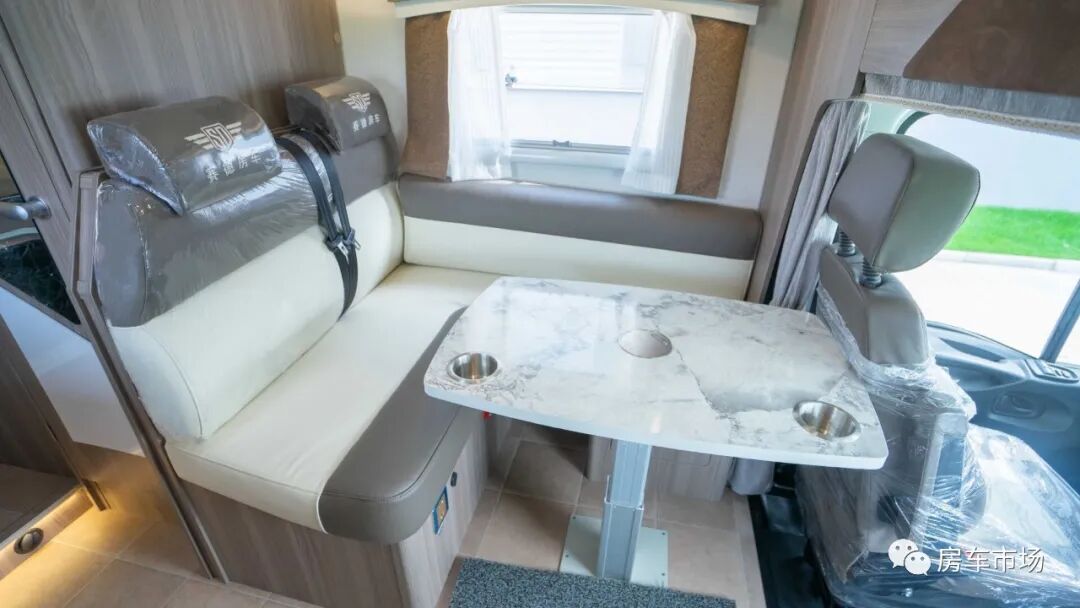 驾驶舱上部配有一张2米的额头大床,睡下两个成年人也很轻松。额头床的两侧都安装了开窗,可透气采光。会客区采用的是“L型”结构的沙发布局,中间配有一张能升降的餐桌,必要时能与沙发组合拼成一张临时单人床,该车为4座布局,结合尾部的双人床共有三张床位,适合夫妻带两个孩子玩。