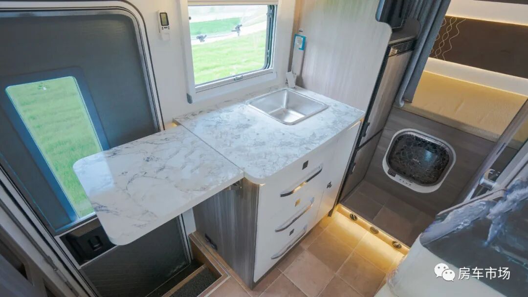 厨房的位置在车门处,台面可以拓展。顶部有吊柜下部是收纳物品的大抽屉,料理台配有高脚水龙头以及洗菜盆。旁边是一台152L双开门冰箱和微波炉。该车的水电储备是非常丰富的配有3000W充逆变一体机以及1000ah锂电池,同时清水箱是280L灰水箱是60L。