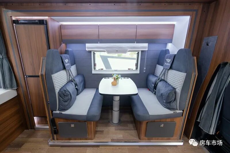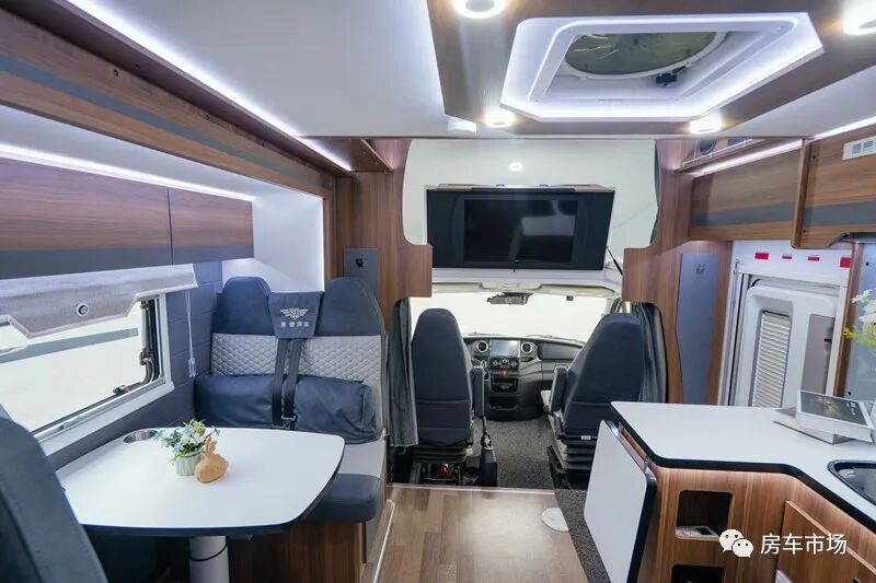 车内座椅采用2+2+2结构,整车可荷载6人。驾驶舱上部有一张2.2米的额头双人大床,内部空间宽裕并配有乳胶床垫,舒适度高。两侧设计有房车专用外推窗,保障日常的采光通风效果。床板掀起后,是一台32寸液晶电视。会客区采用对卡座结构,配有宽大的沙发以及升降餐桌,可拼成一张临时床位。内侧配有外推窗,上部是一组储物吊柜。在卡座的后部还配有一台12V-152L双开门车载冰箱。