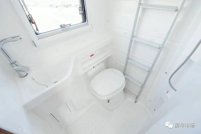 车尾配有一张拓展床位,三面配有开窗,上部则是一组储物吊柜。为方便上床休息,尾床下部设计有台阶,并配有4个暖风出风口。尾床外围的布帘可隔光和保护隐私。独立的卫浴间空间宽裕,吸塑式设计防霉防潮好清洁,配有进口盒式马桶、面盆、水龙头、淋浴花洒、外推窗、化妆镜以及换气扇。水电方面,该车配有3000W充逆变一体机、1000ah锂电池、500W太阳能、280L净水箱、60L灰水箱。