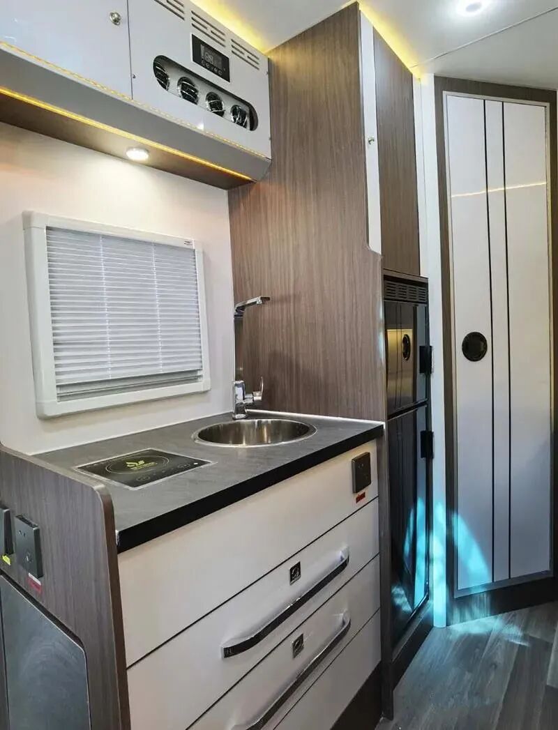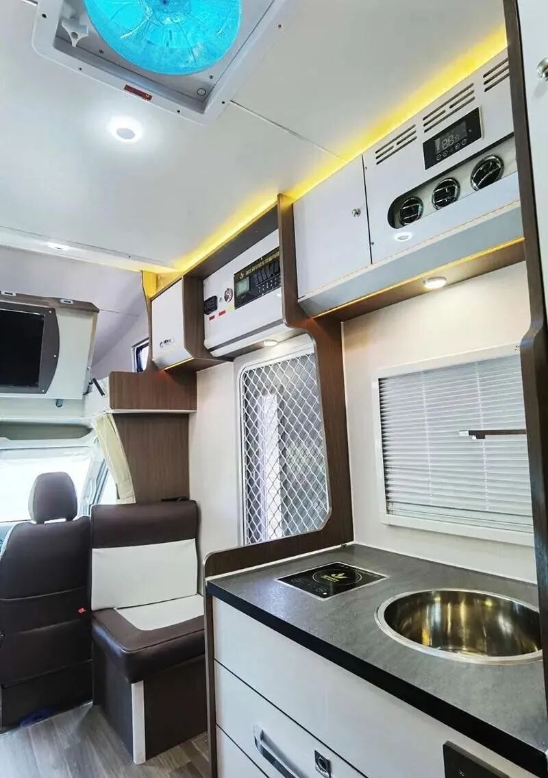 左侧是房车的厨房区域,整体配有电磁炉、洗菜盆、储物抽屉及隐藏式拓展桌板;再往上是该车的48V房车专用空调,省电高达30%。紧挨着厨房区的立式大衣柜和48V 133L房车专用冰箱。