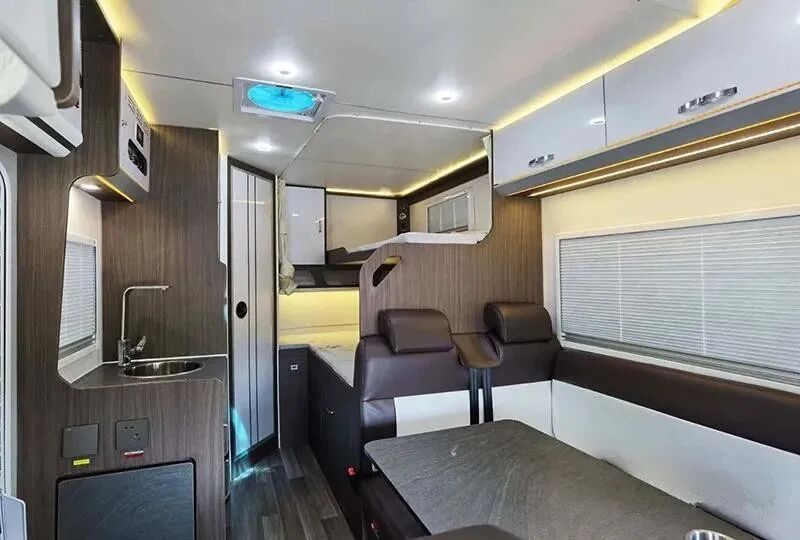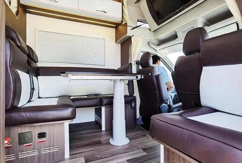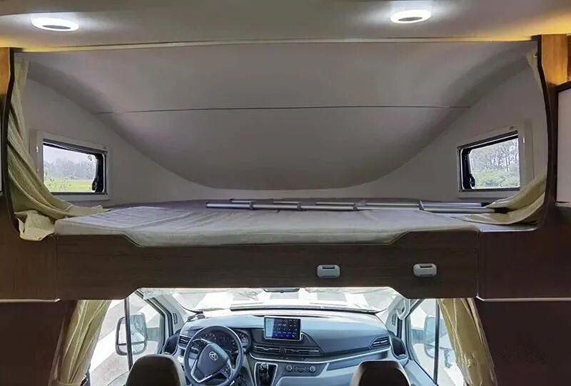 房车内部的总体布局从前往后依次为额头床、会客区、厨房区、睡卧区和卫浴间。额头床的床铺尺寸是1600x2200mm,睡下两个成人完全没问题,对立式的车窗通风性更佳,床沿下方可翻转的智能电视可提供娱乐享受。