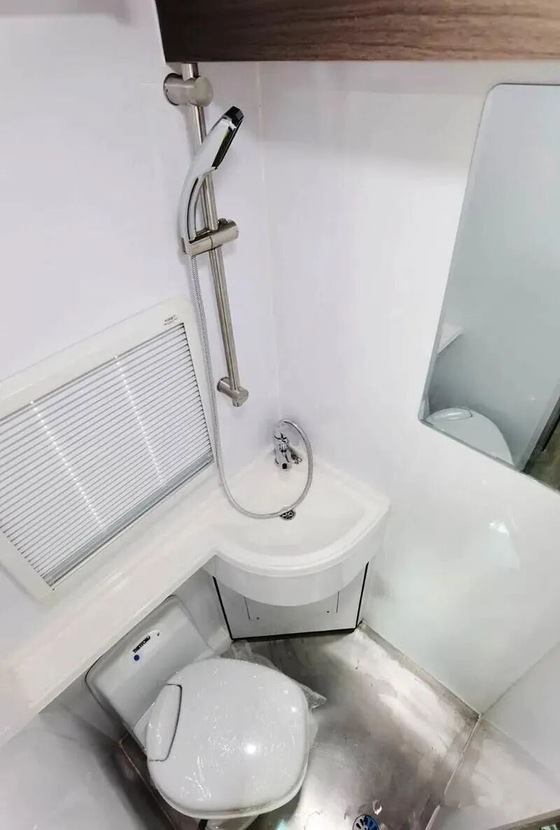 车身左右两侧配置丰富,右侧设有遮阳棚、电动踏步、抽拉式户外炉灶、双层门设计的乘客门(带防蚊纱帘);左侧是水电接口、市电接口、散热口及贯通式储物仓;尾部配有备胎,出行无忧。