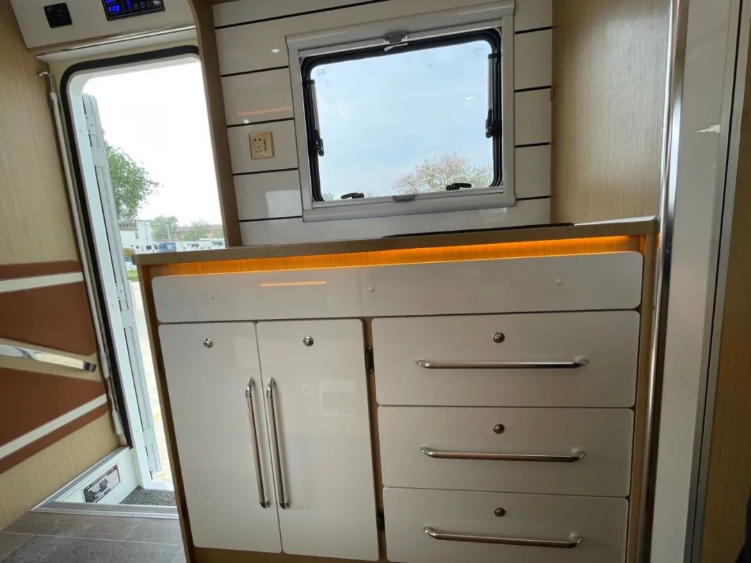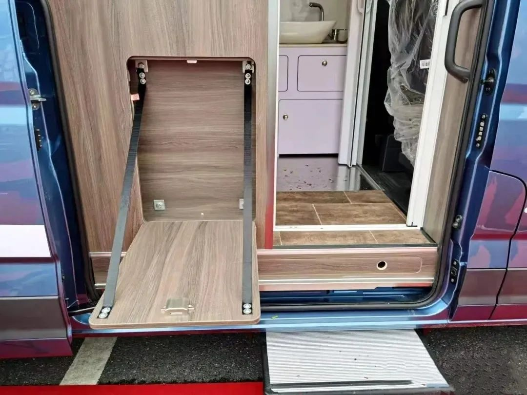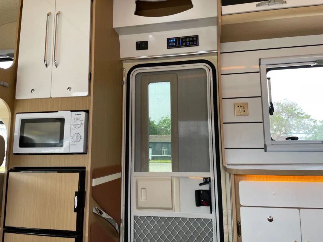 ● 房车车门采用的是侧滑开的形式,配有可拓展面板,在户外休闲娱乐时可放置日常生活用品。车门配有防蚊纱窗,即可免去蚊虫入室的烦恼也可保证房车内部通风换气,设计贴心;