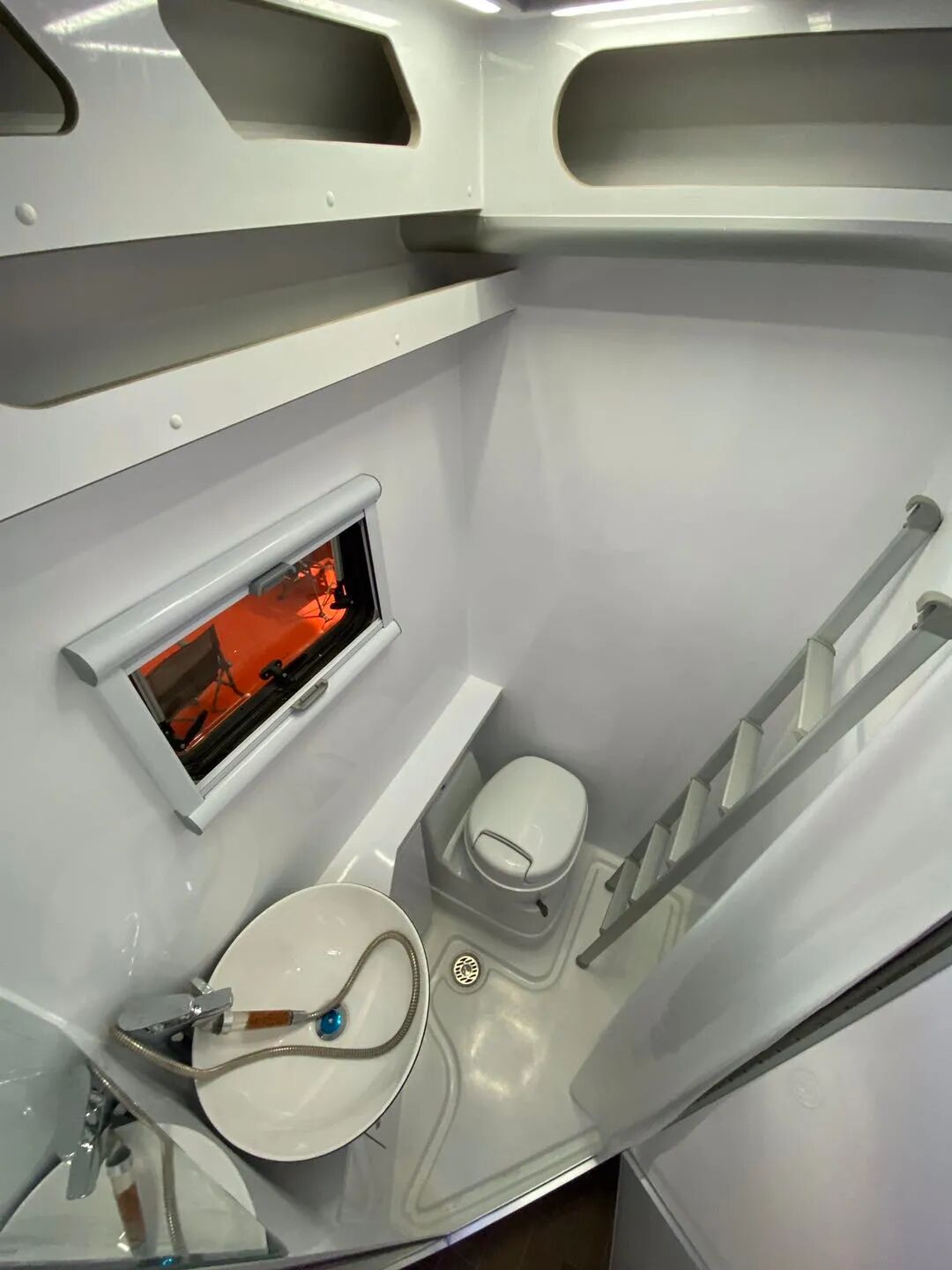 ● 独立固定式卫生间,房车标配塞特福德盒式马桶,双向换气扇;