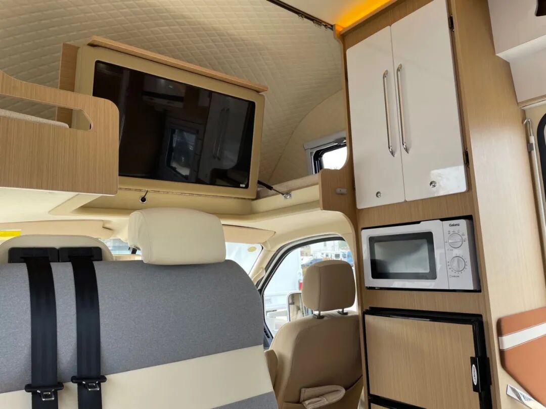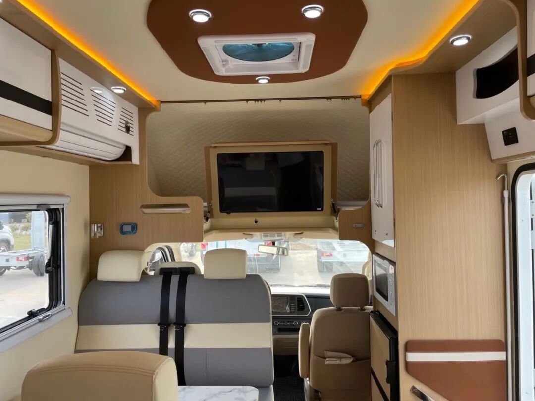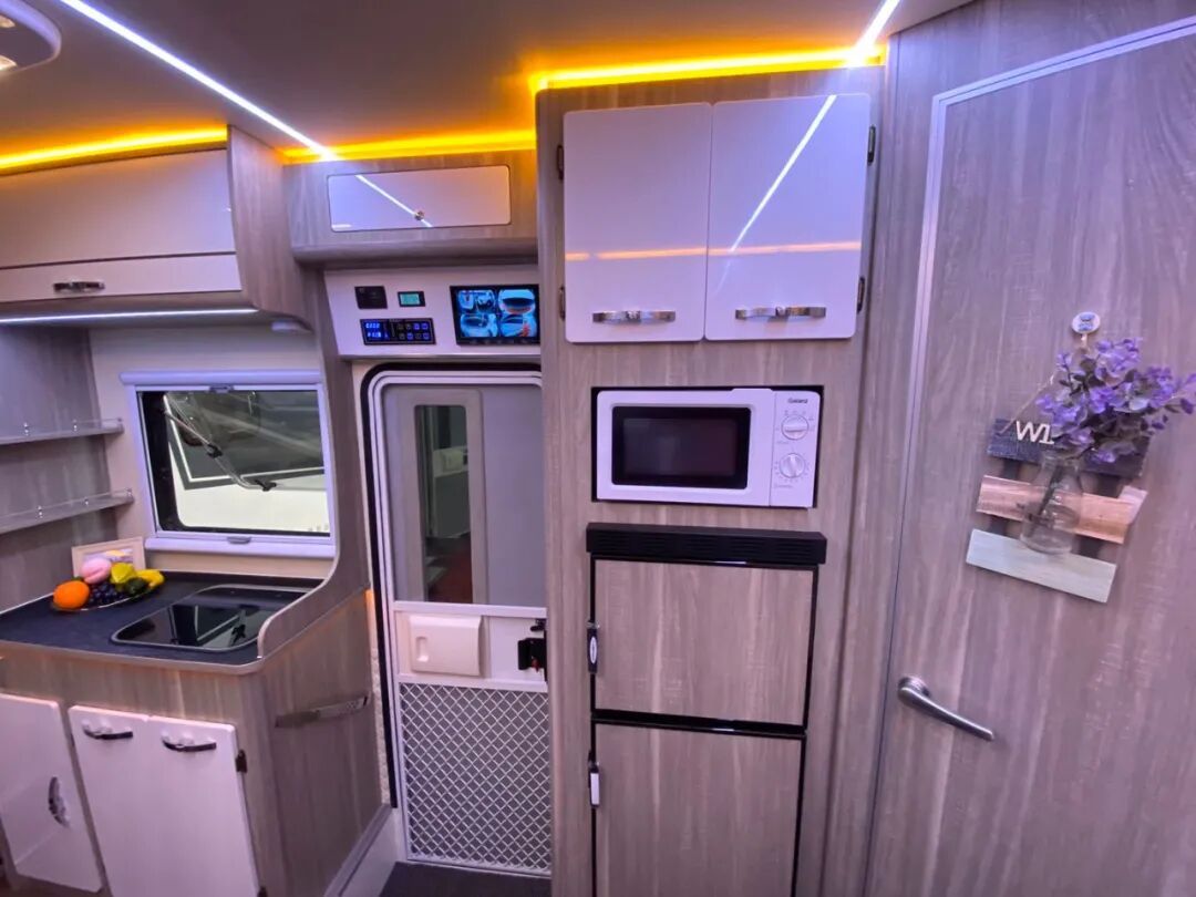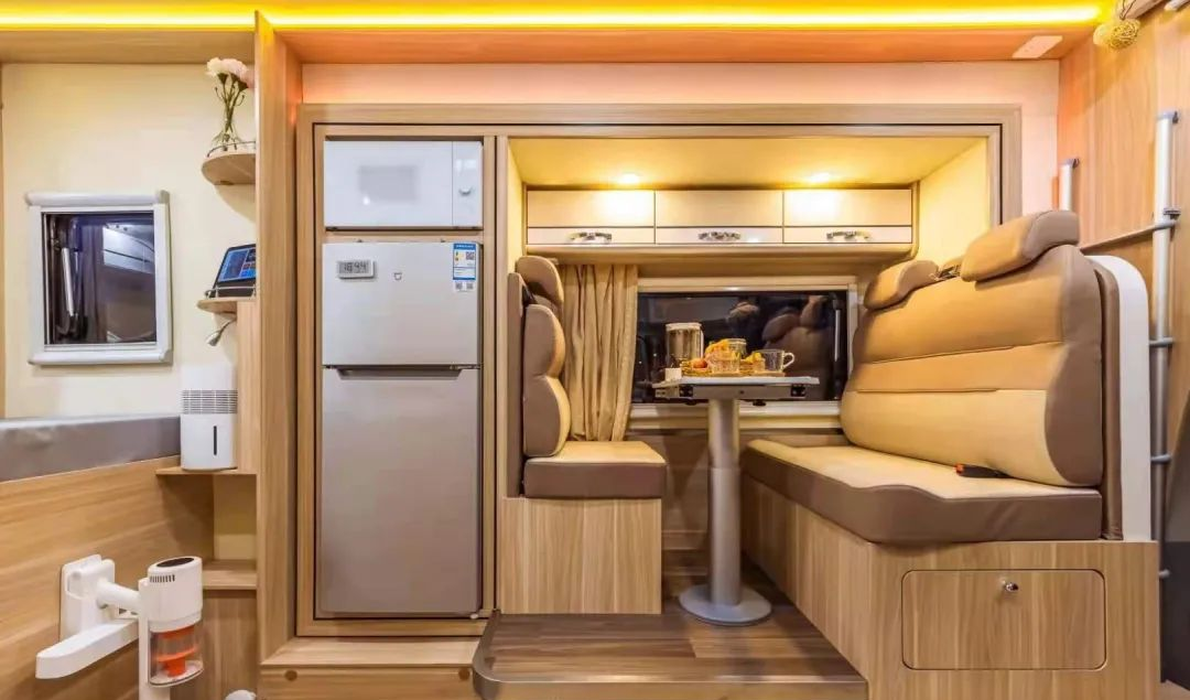 ● 房车内置19寸吸顶电视,85L冰箱,并配有微波炉、行车空调,旅行安全舒适;