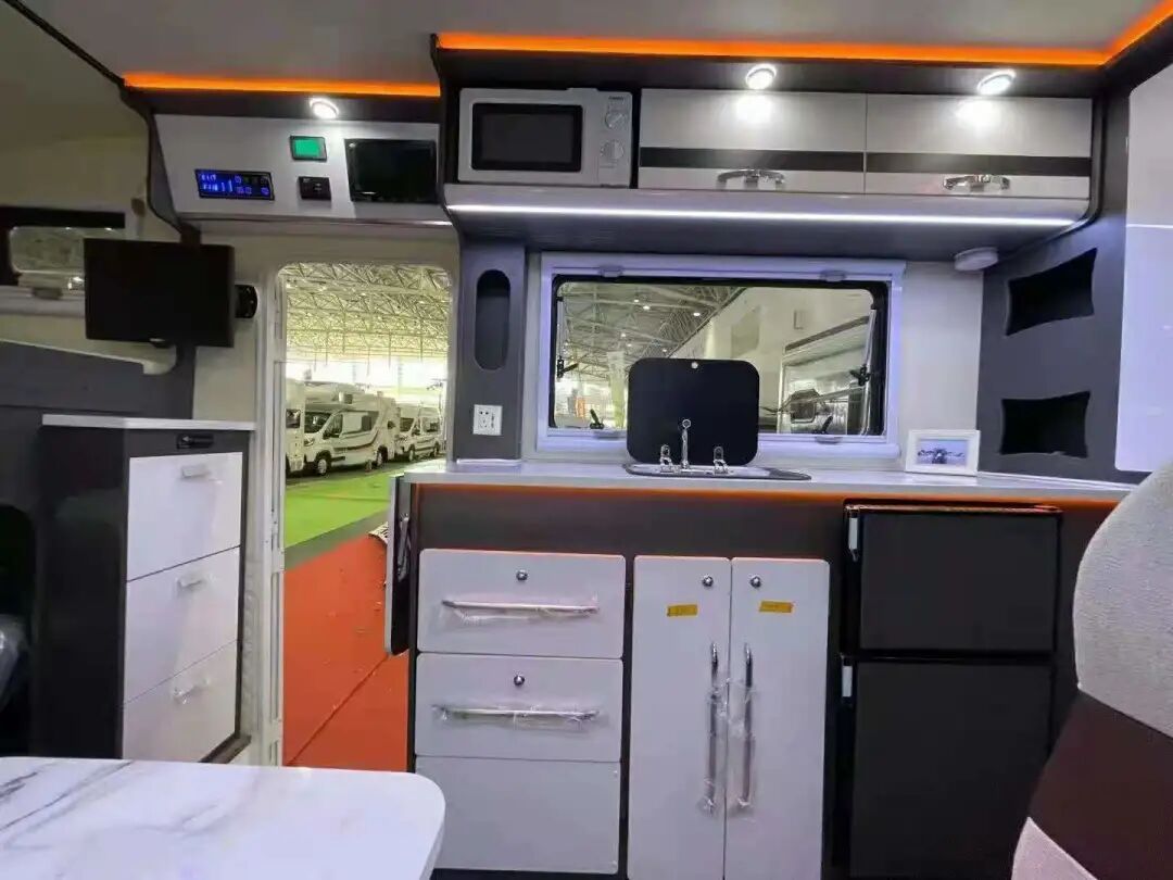 ● 水电方面:配有120L清水箱、75L的灰水箱;3000W逆变器、200AH电池组、200W太阳能板、85升的车载冰箱、微波炉等。