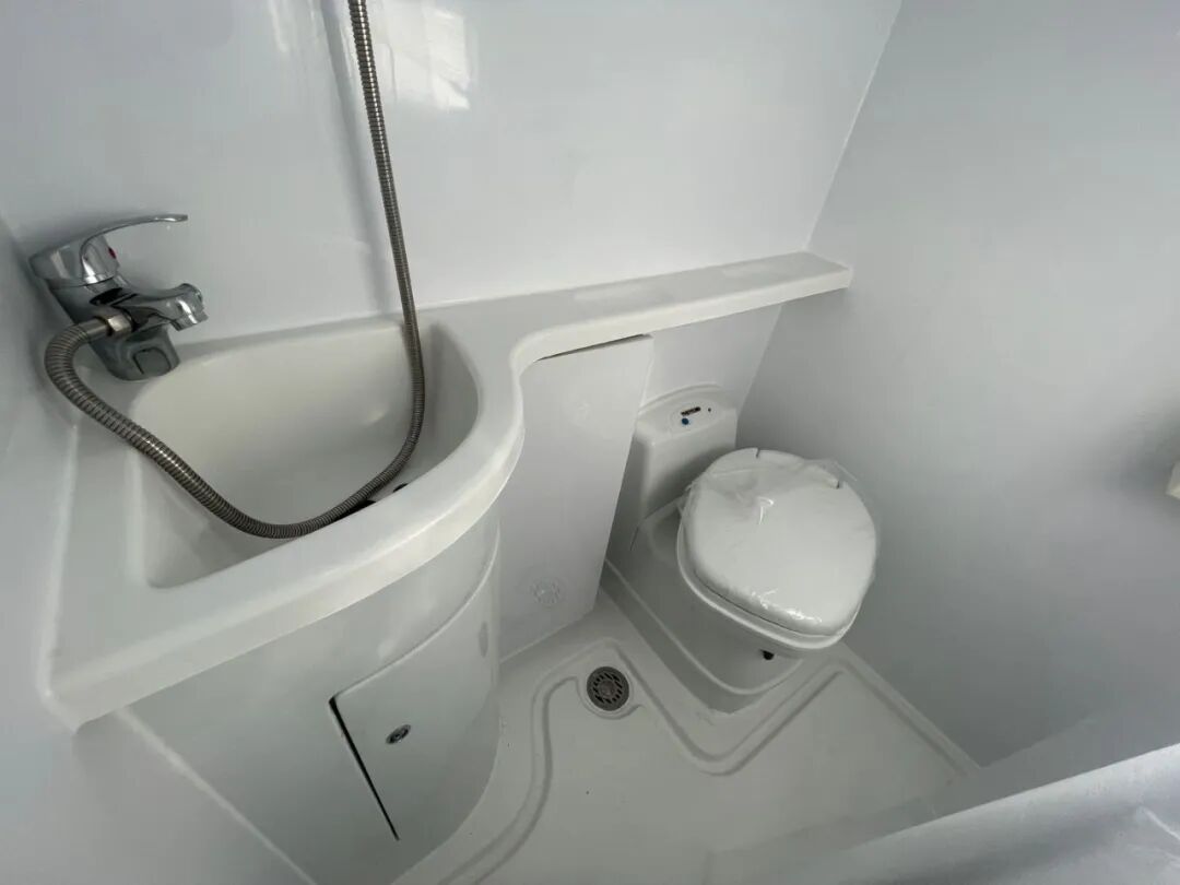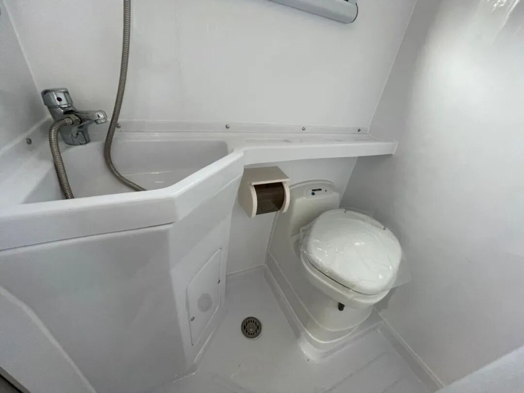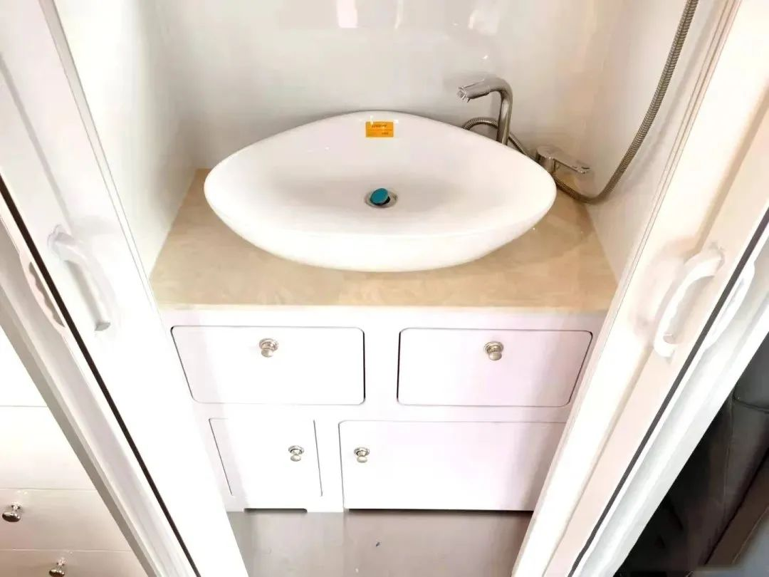 ● 卫生间区域地板材质采用PVC,不易进水和起泡。下方有塞特府的旋转马桶,旁边陶瓷式固定洗手池,外推窗,贴心小挂钩,上方双向换气扇。配有240L清水箱,80L灰水箱,18L黑水箱。