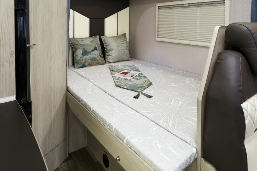 内饰布局上,从前到后依次是驾驶区、会客区、厨房区、卫生间区和休息区。会客区设计了L型沙发卡座,可升降餐桌,驻车休息时,可以将升降桌放下,形成一个单人床。在沙发卡座的对面,设计了一个单人小沙发,与会客厅形成了闭环。额头床依旧是2300*1400mm的尺寸,带爬梯,可方便上下床。