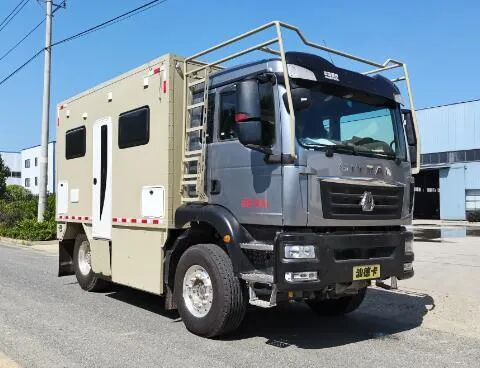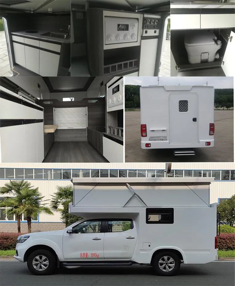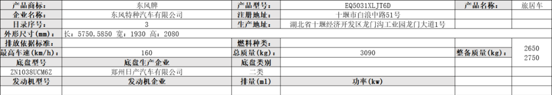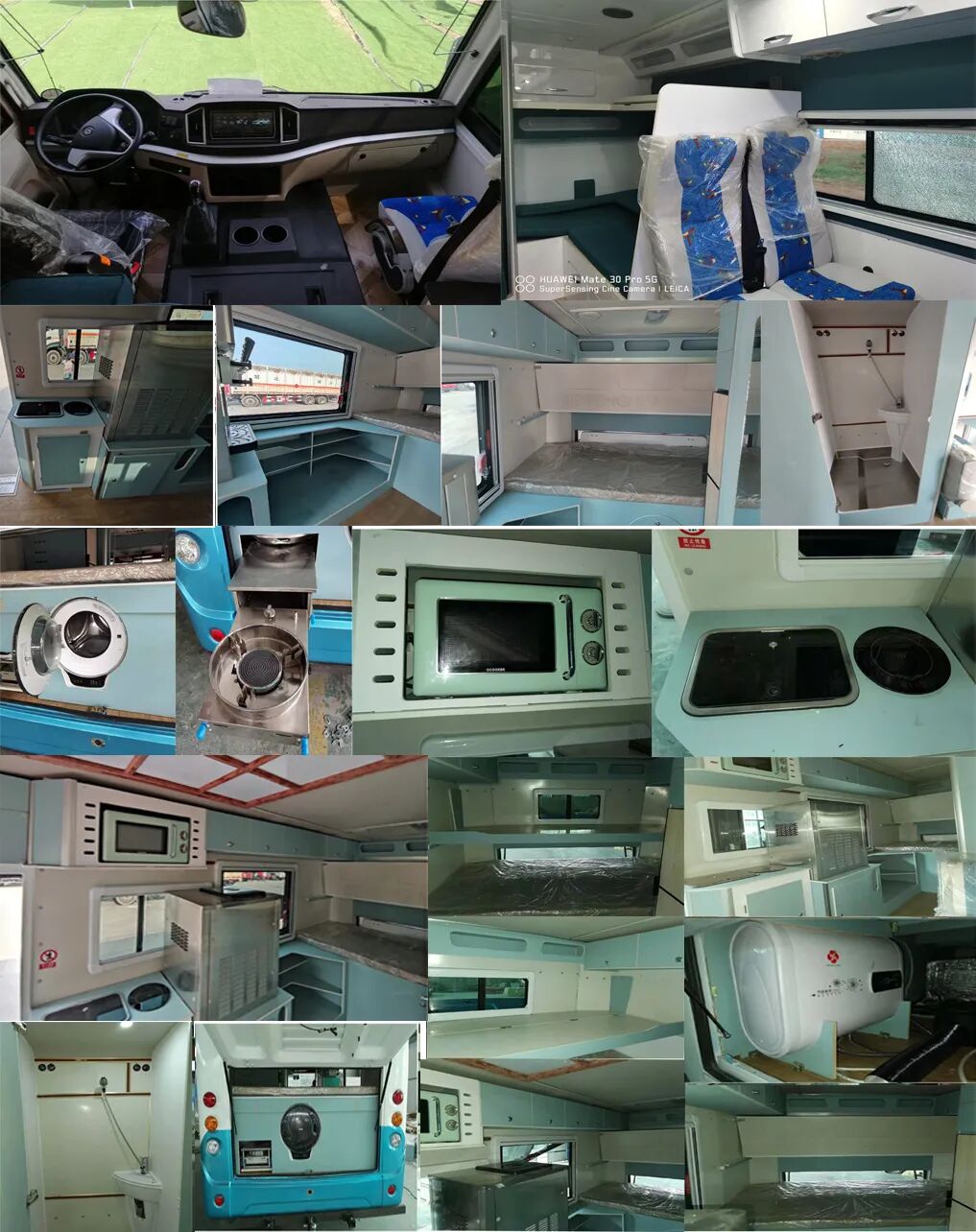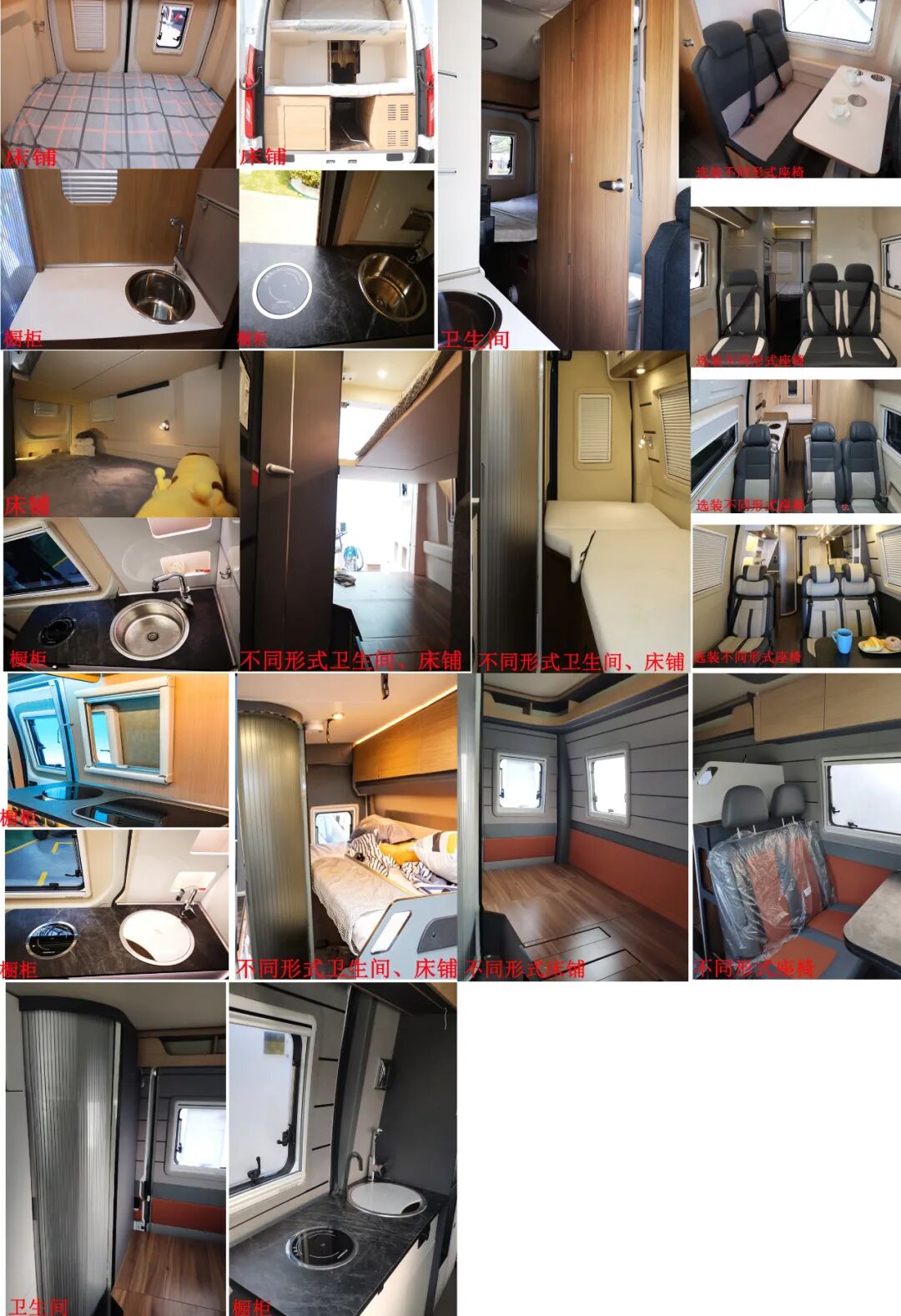 该车型基于东风特种客车底盘打造,该车型未安装新的座椅,仅拆除基础车型原装座椅;车顶无选装时高度3030mm,选装顶部换气扇尺寸3130,选装太阳能板;选装行李架时高度为3220mm;车内配备储物柜,座椅,沙发(打开后为卧具)可选装后爬梯,厨具,多媒体设施,给排水设施,卫生设施等旅居生活设施和娱乐设施;车;