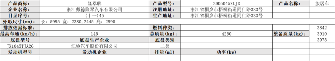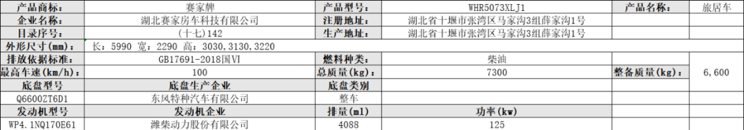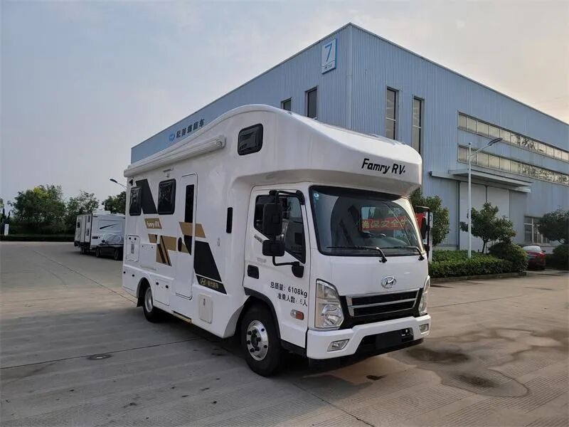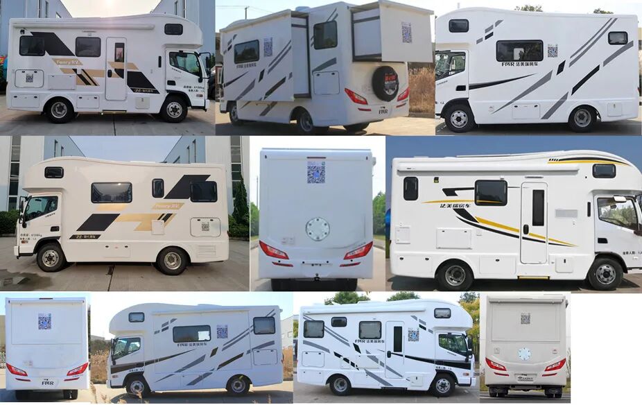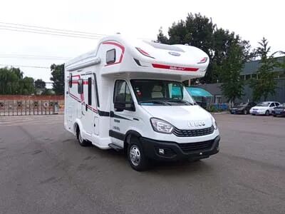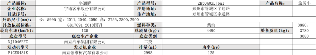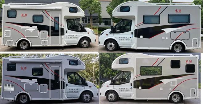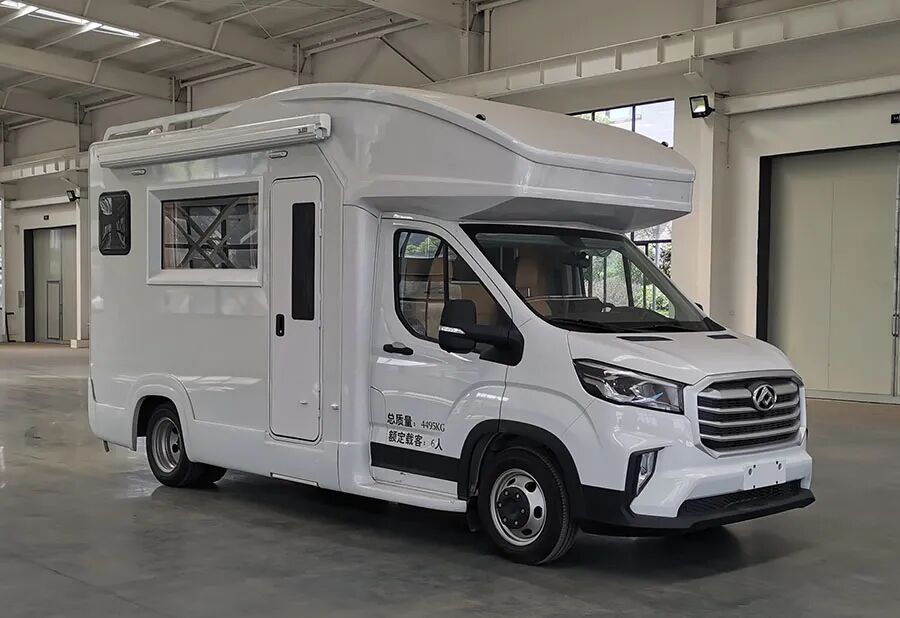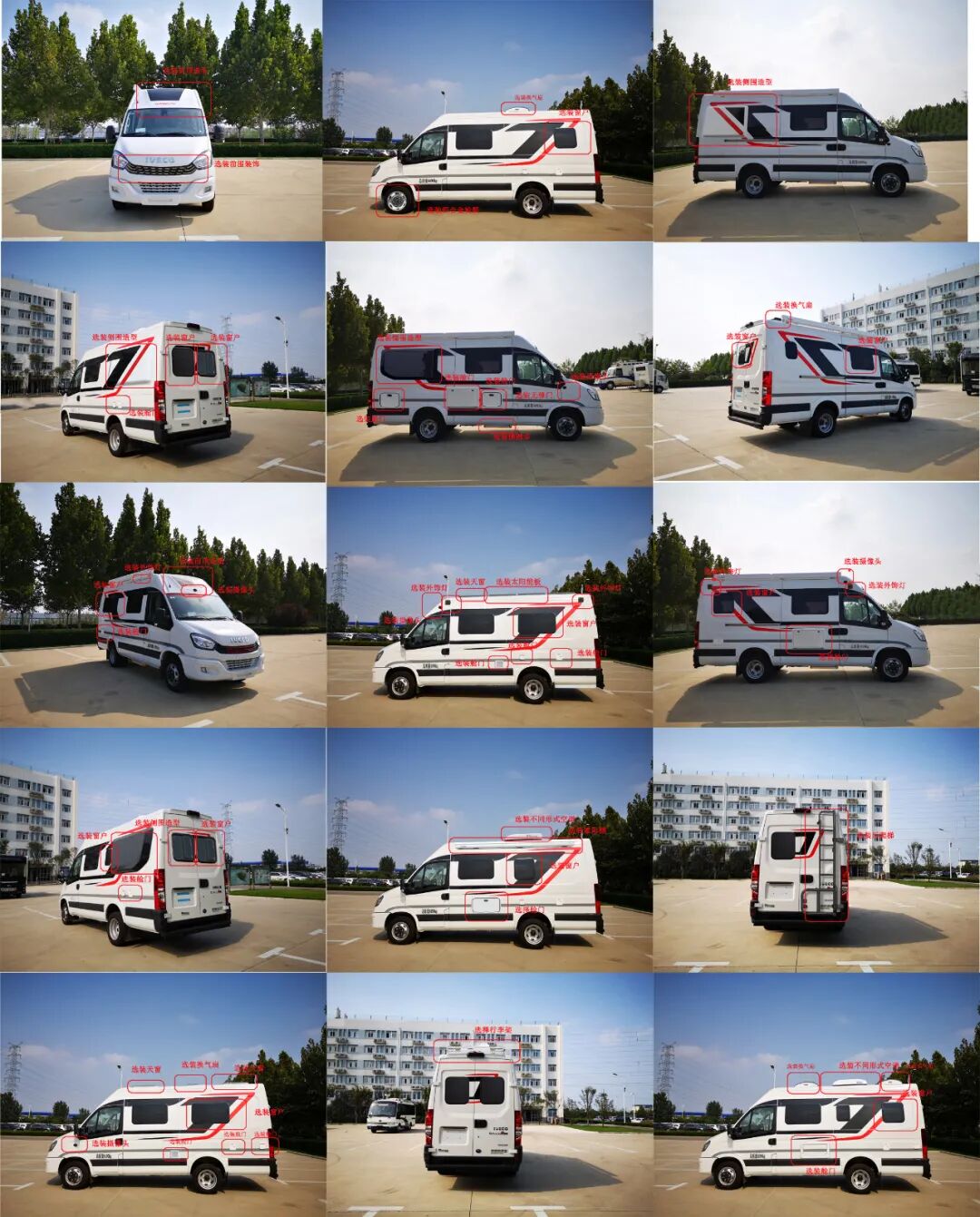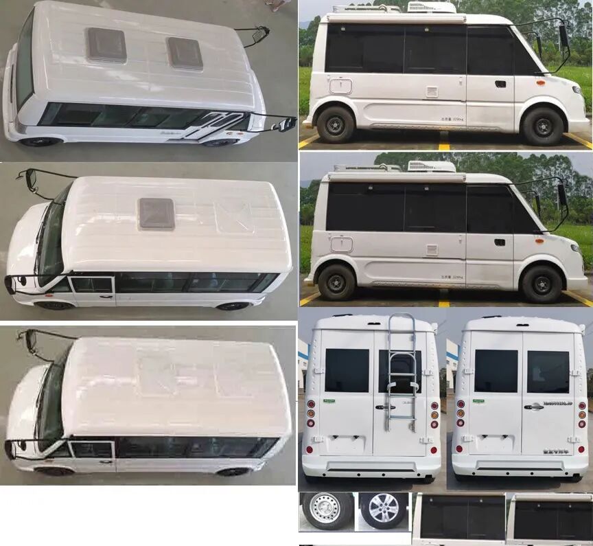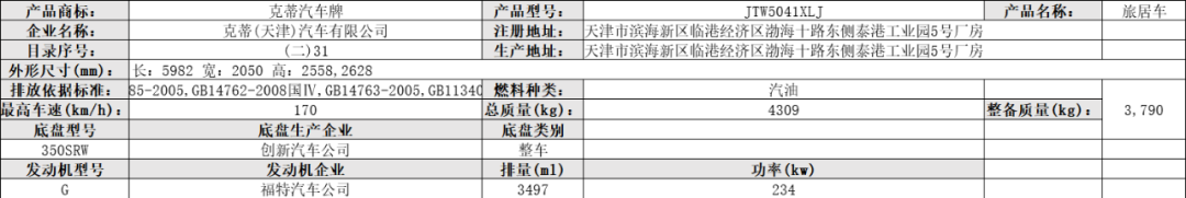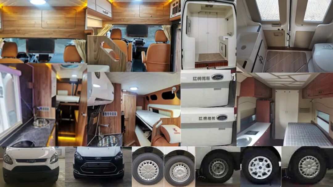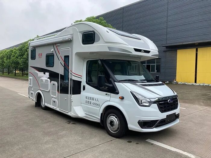 该车型采用福特底盘打造,配备冰箱、厨具、卧具、卫生设施和旅居设施等专用装置,整备质量为3978kg时核定载客为4人、整备质量为3910kg时核定载客为5人、整备质量为3842kg时核定载客6人;该车侧后防护为裙板结构,侧防护离地高度为250mm,后防护离地高度为350mm;