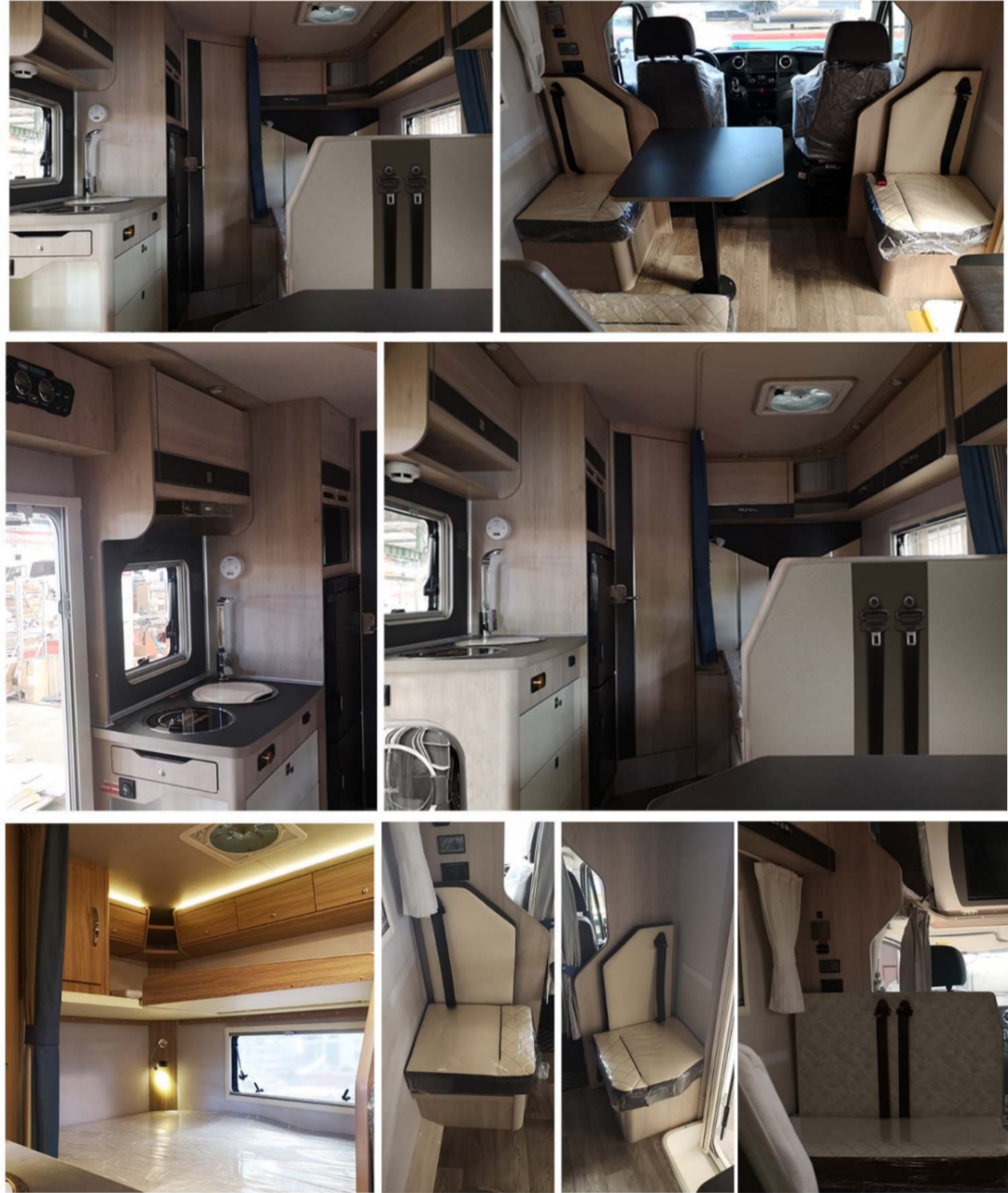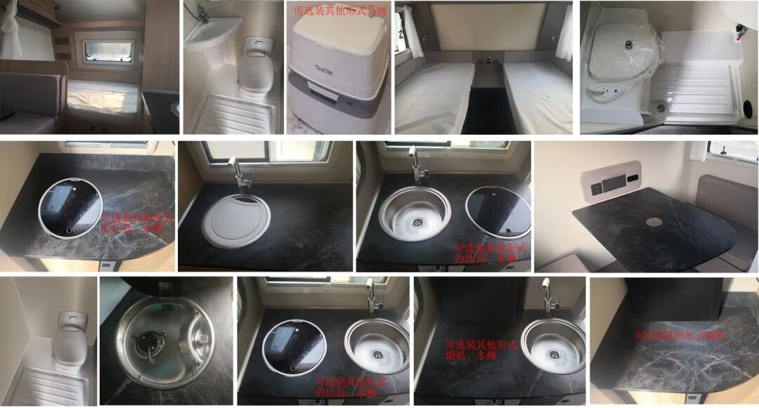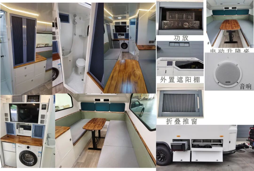 该车装备炊具,桌椅,睡具,卫生设施等设施;主要用于外出旅游居住,方便出行;选装内饰布局,选装侧面开窗及舱门位置及大小,选装后部开窗位置,选装后部安装或不安装自行车架及爬梯结构,选装后部仓门位置;ABS 型号:VIE ABS-Ⅱ,生产企业:浙江万安科技股份有限公司,型号:CM4XL-4S/4M,