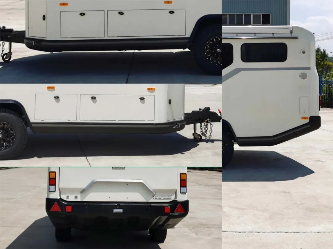1、侧防护装置为裙边结构,材质为Q235A,离地高度:410mm;后防护装置材质为Q235A,连接方式为螺栓连接,后防护装置的断面尺寸(高×宽)mm:100×50,离地高度:450mm,连接方式为螺栓连接;2、配备桌椅,厨具,睡具,卫生设施等旅居生活设施;3、车辆两侧可选装遮阳篷,两侧或右侧安装遮阳棚时对应的整车宽度为2500mm,左侧按装遮阳篷时对应整车宽度为2400mm,两侧不装遮阳篷对应整车宽度为2300mm,选装车辆内饰;