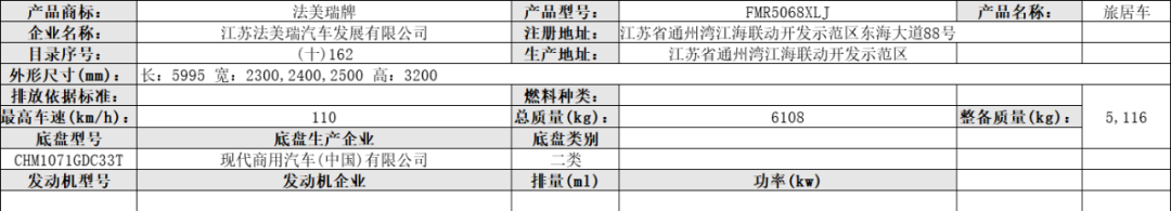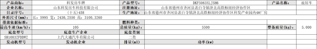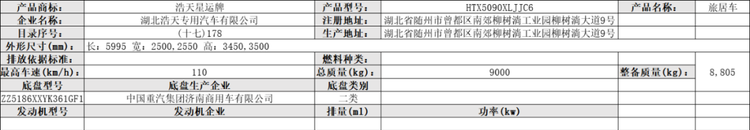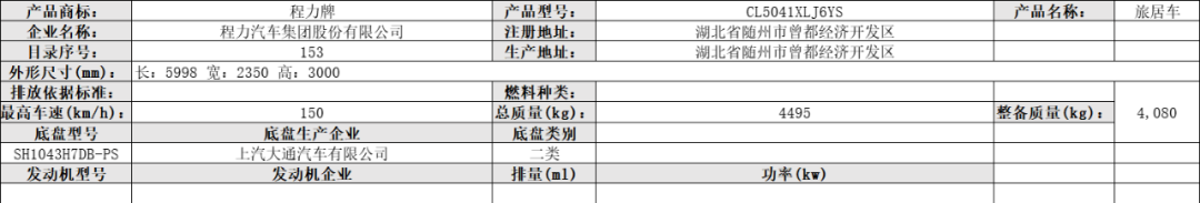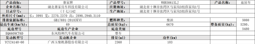 该车设有睡具,炊具,空调,卫生等设施;选装自行车架时长度为5615mm;选装后挂备胎时长度为5595mm;可不选装后部爬梯、自行车架、后挂备胎时长度为5341mm;选装顶置空调时高度为2595mm;选装排气扇时高度为2505mm;ABS系统控制器型号:EV5051,生产厂:博世汽车部件(苏州)有限公司;