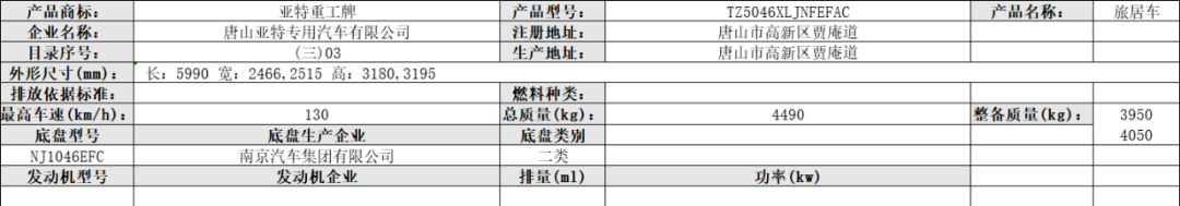 从外观来看,亚特本次申报的车型应为纪念版Y9依维柯版本,新车在外观、内饰、配置方面进行非常大的改善;侧面和后部结构为裙边结构,后部结构离地高度为470mm;该车专用装置由睡具、炊事设施、卫生设施、座椅等组成,是用于旅居的专用车辆;可选装ETC车载装置;